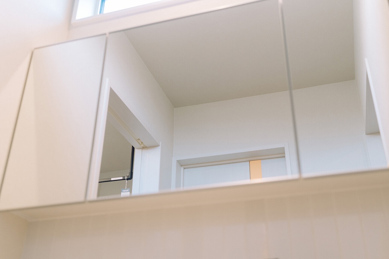 パウダールームには、耐水性・耐熱性・耐久性に強いメラミンカウンターに、収納量たっぷりなミラーキャビネット。