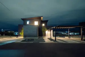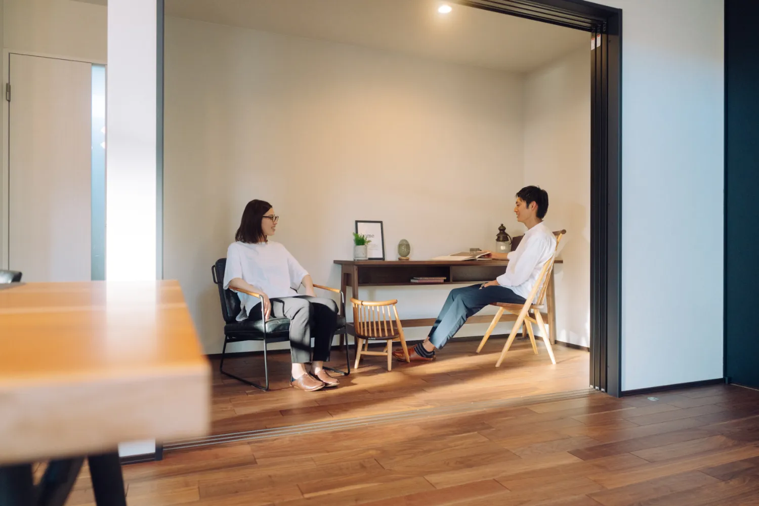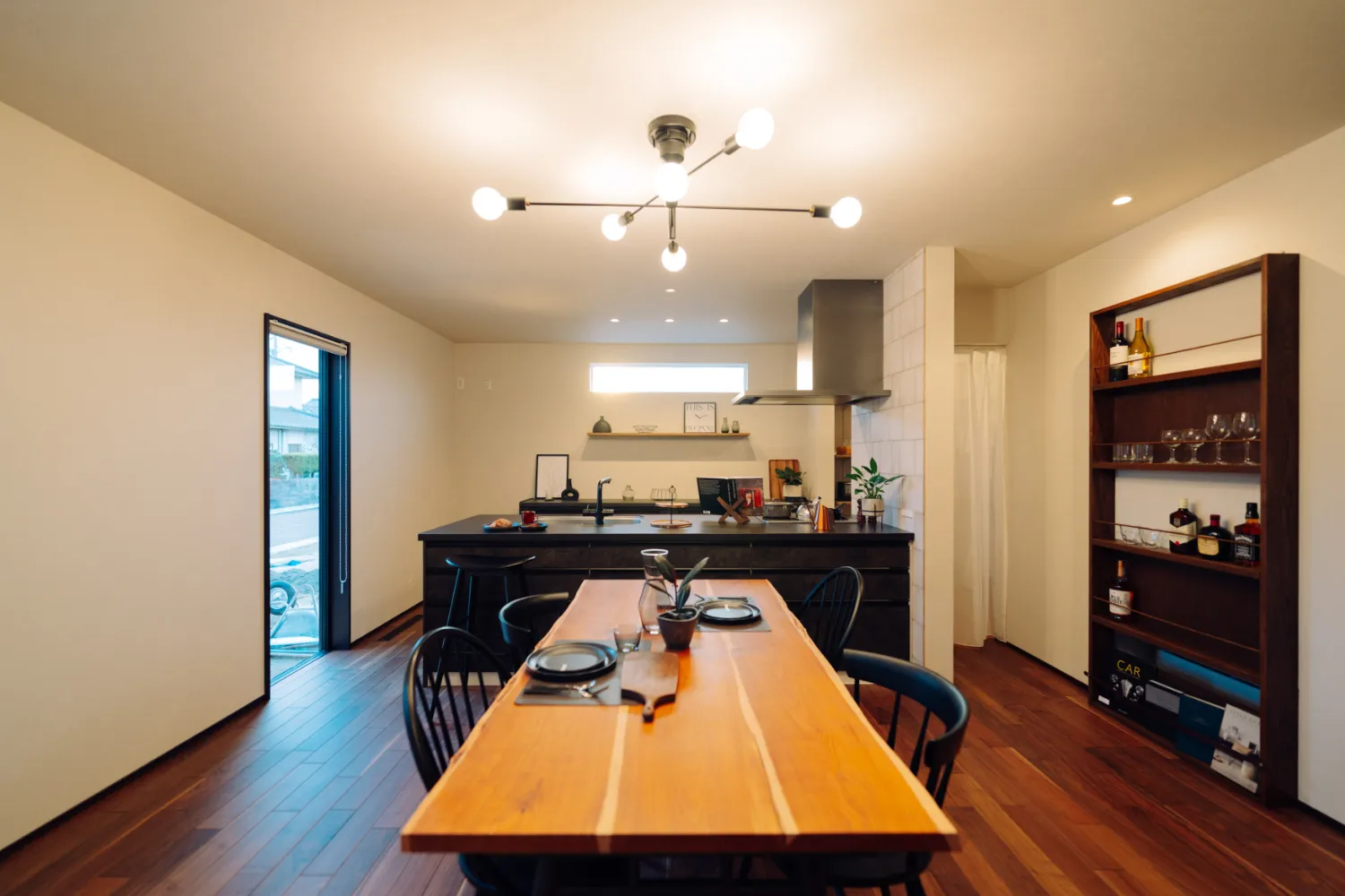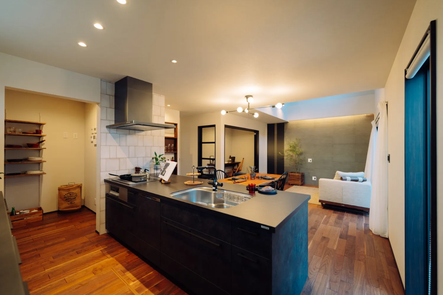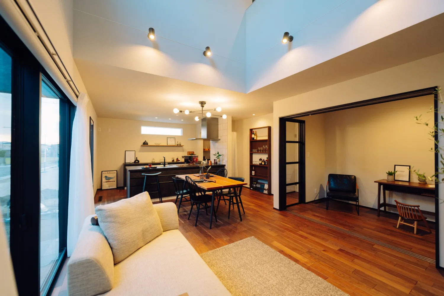 吹き抜けのあるリビング横には、ブラックフレームの間仕切が印象的な多目的スペースを配置しました。