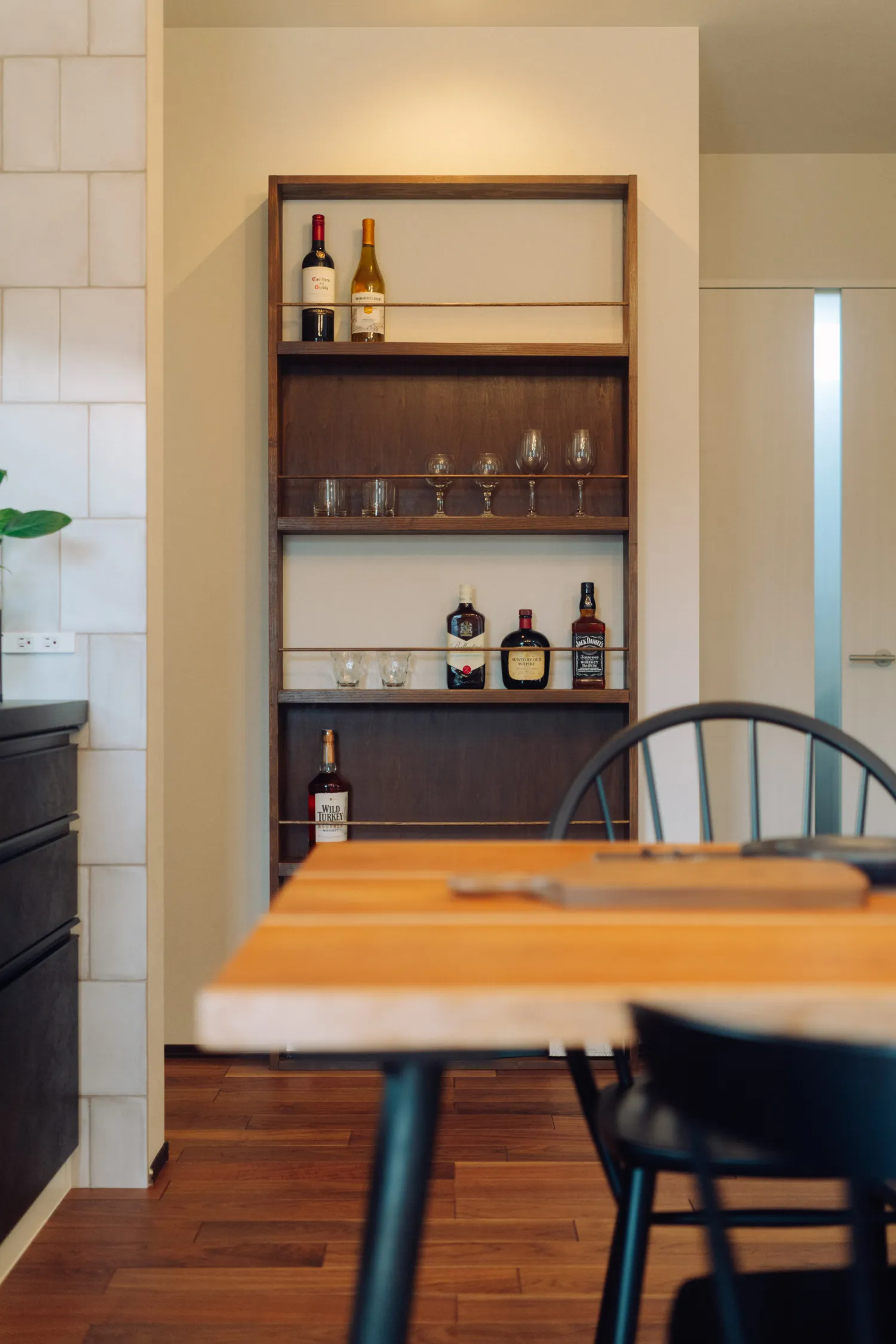 お酒好きなご夫婦のご要望で、木×革のシックな風合いの造作のワインラックを設置しました。