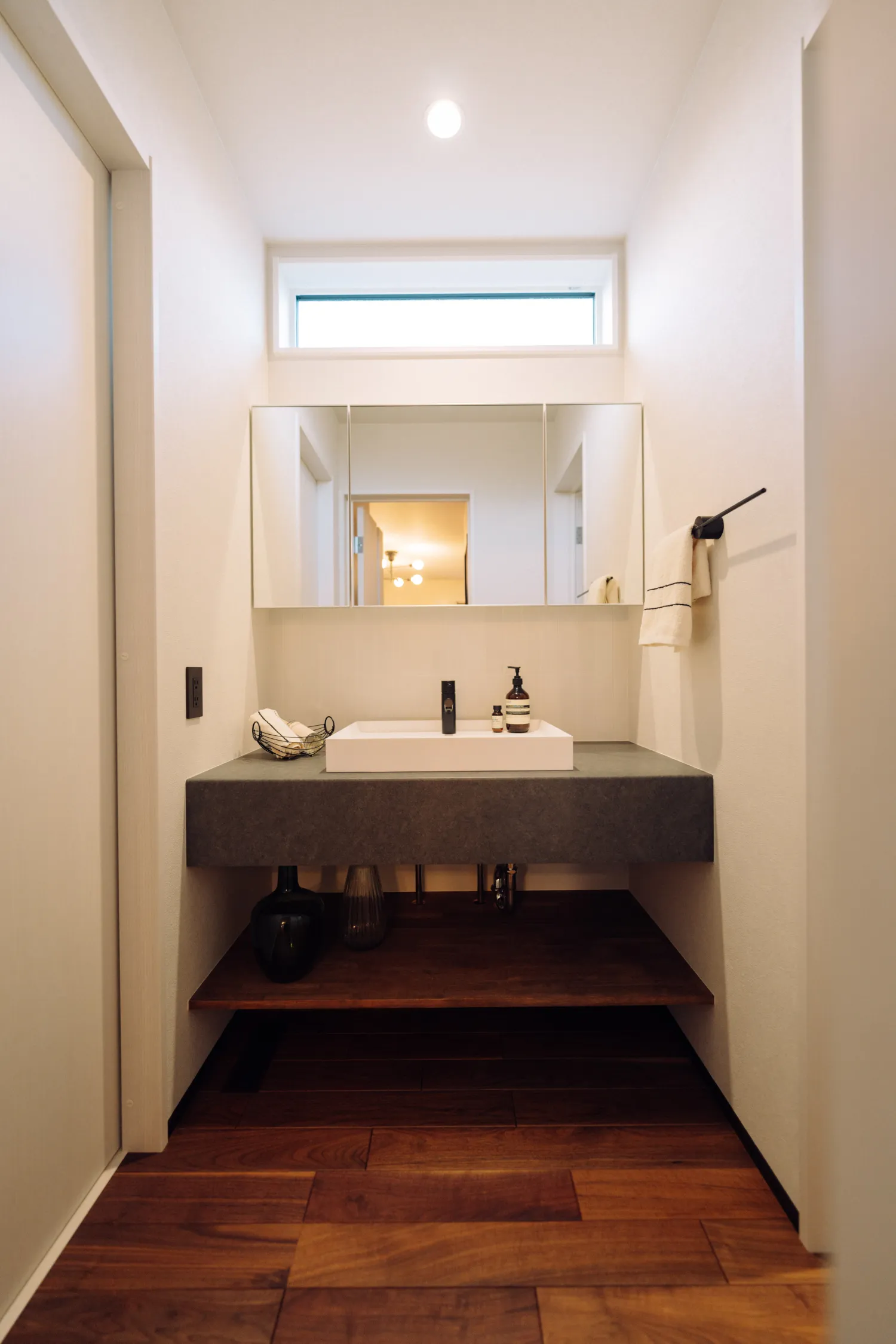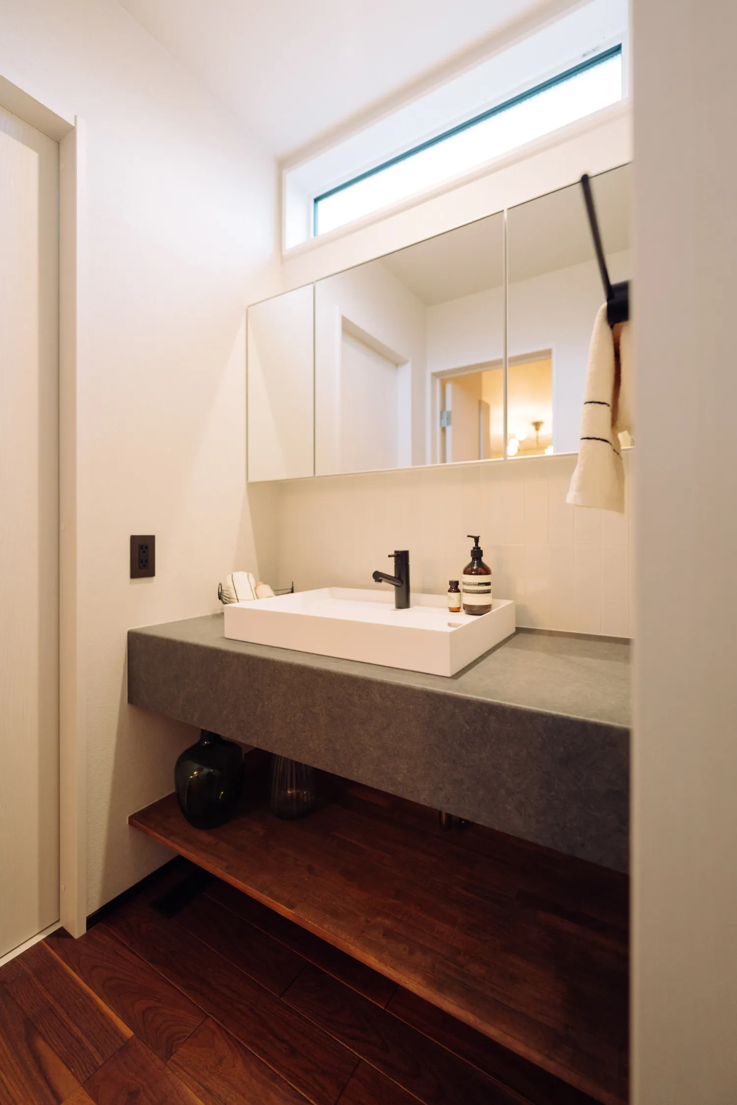 造作のタオルニッチはお家のイメージに合わせてブラックでクールな印象に。