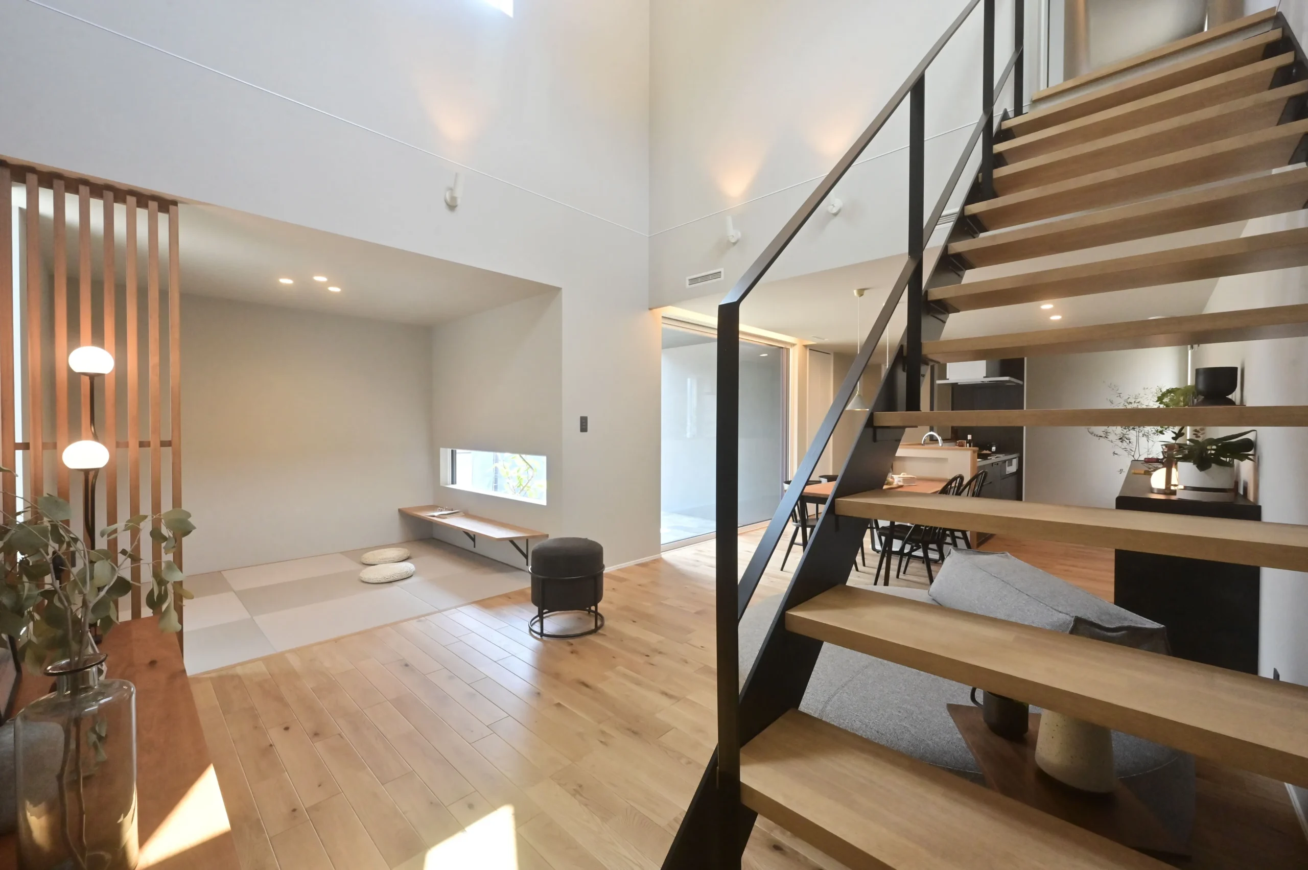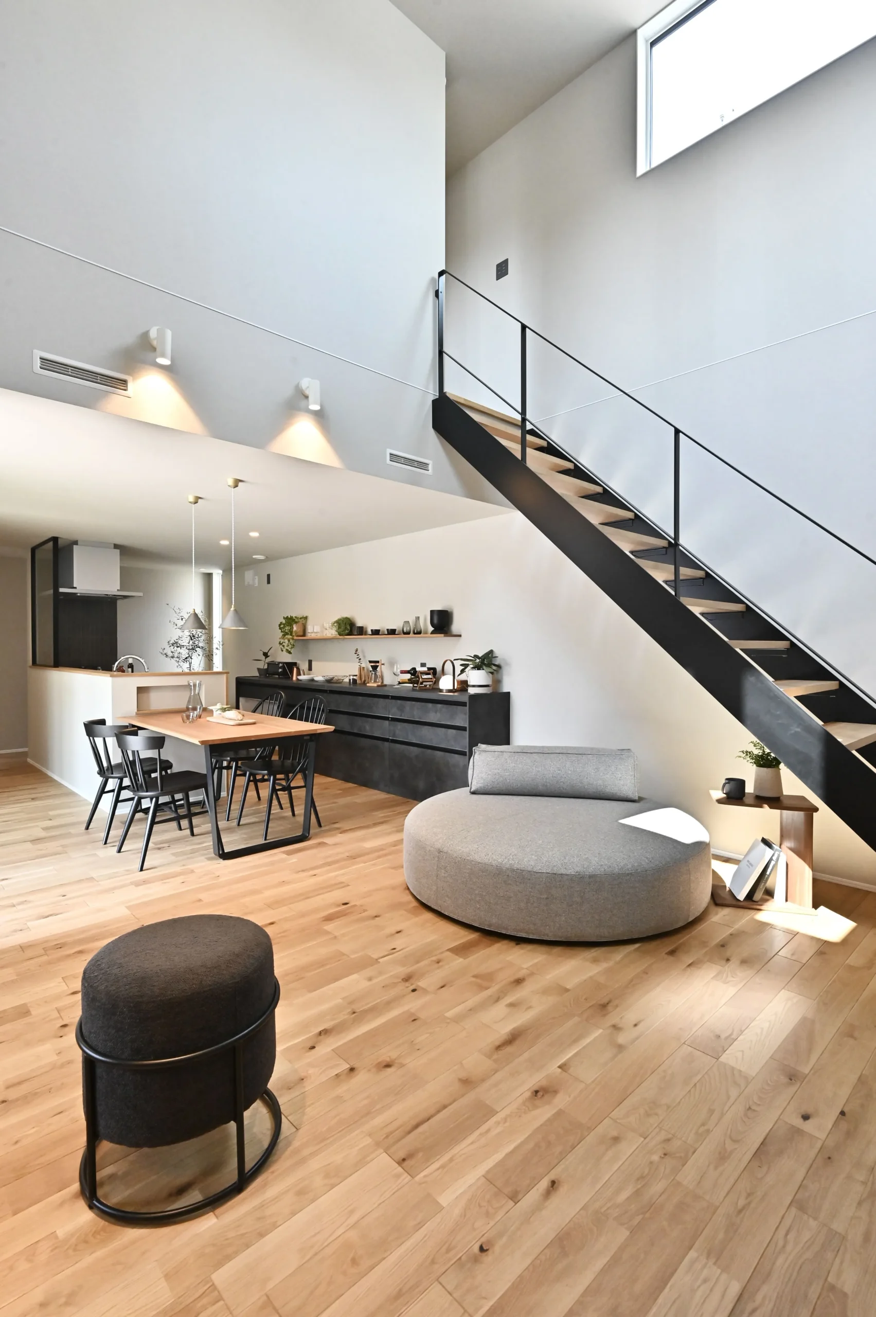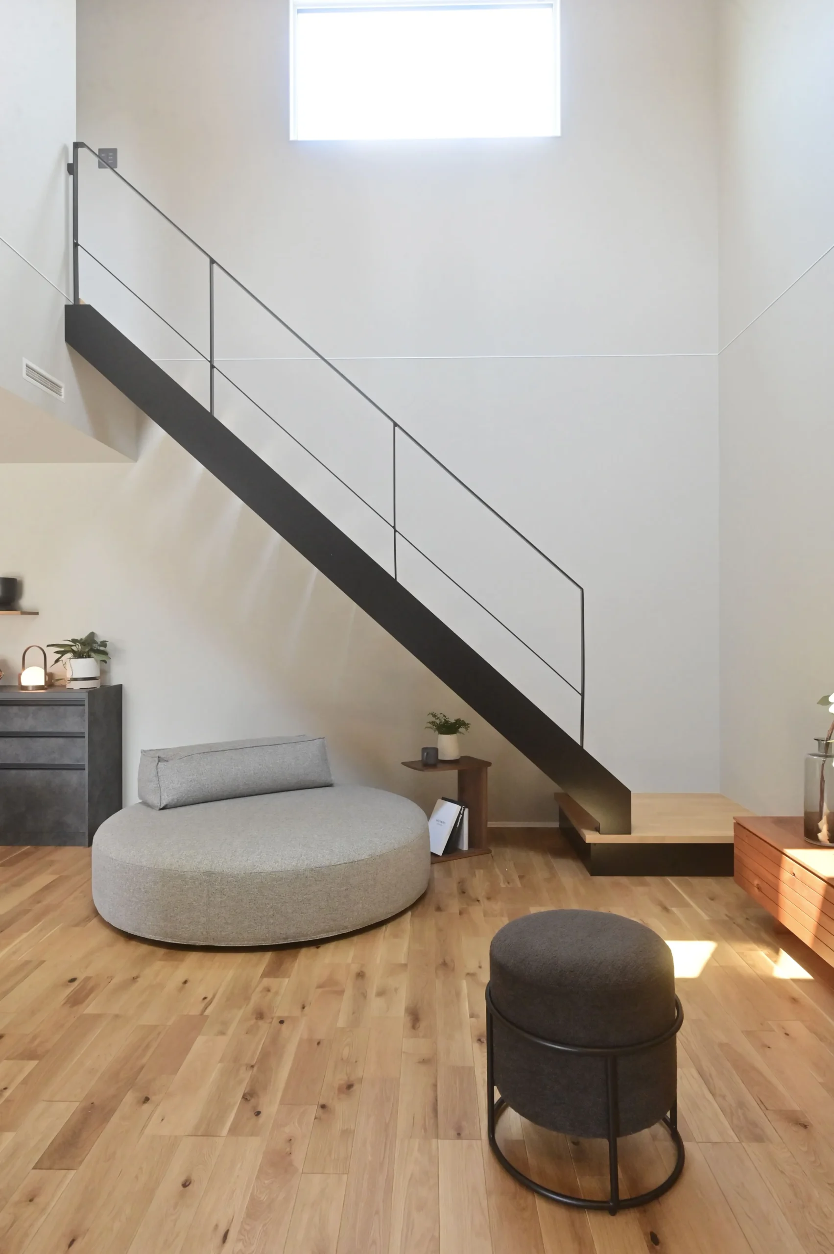 アイアンのスケルトン階段は、軽やかさと遊び心を添えて、