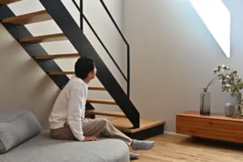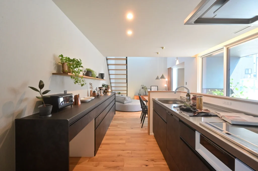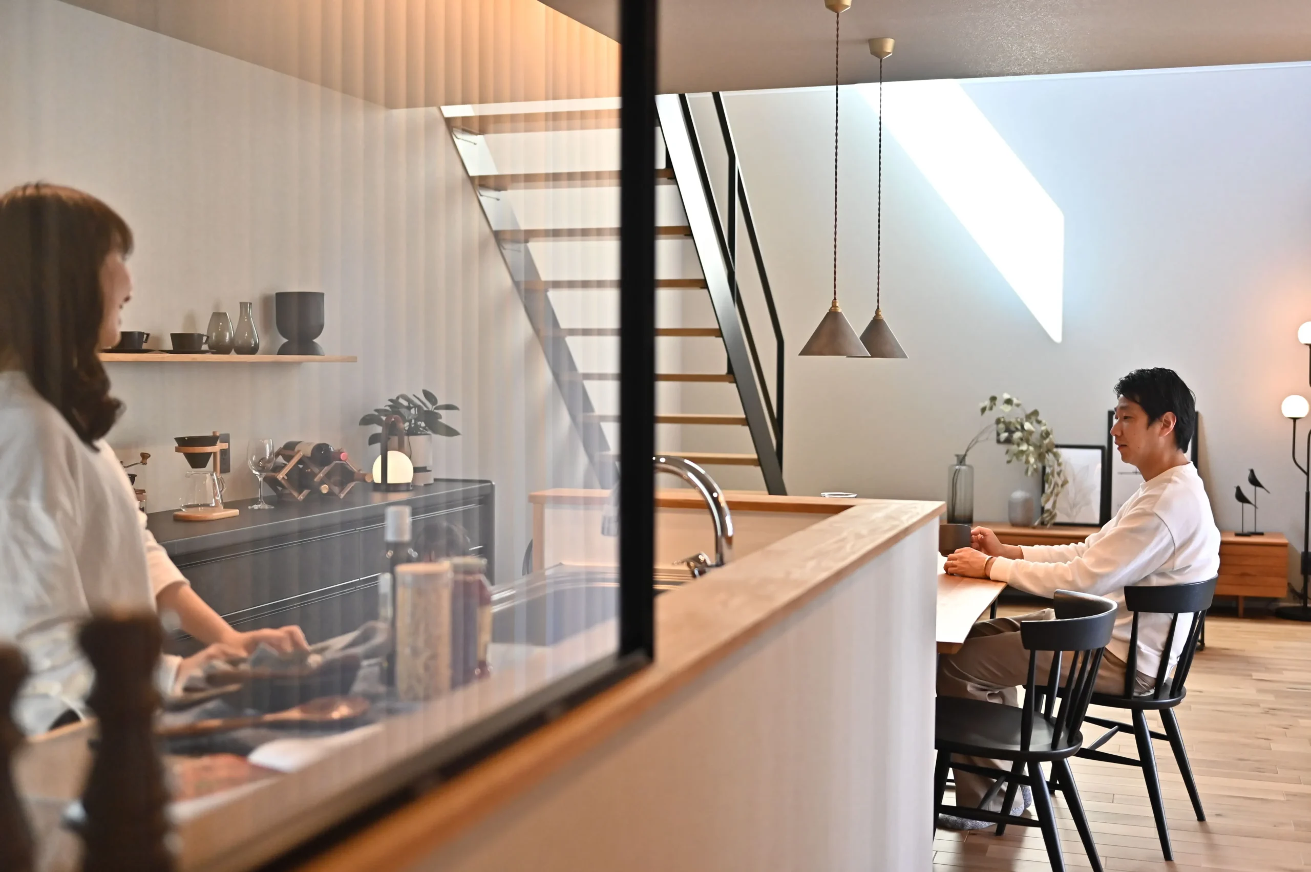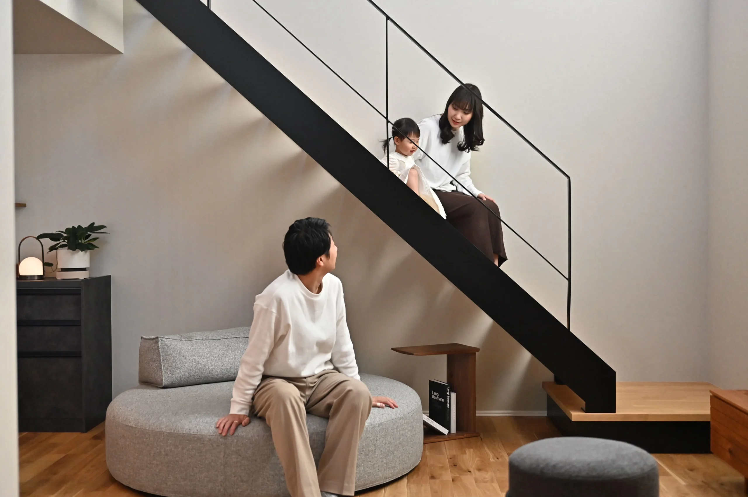 アイアンのスケルトン階段は、軽やかさと遊び心を添えて、