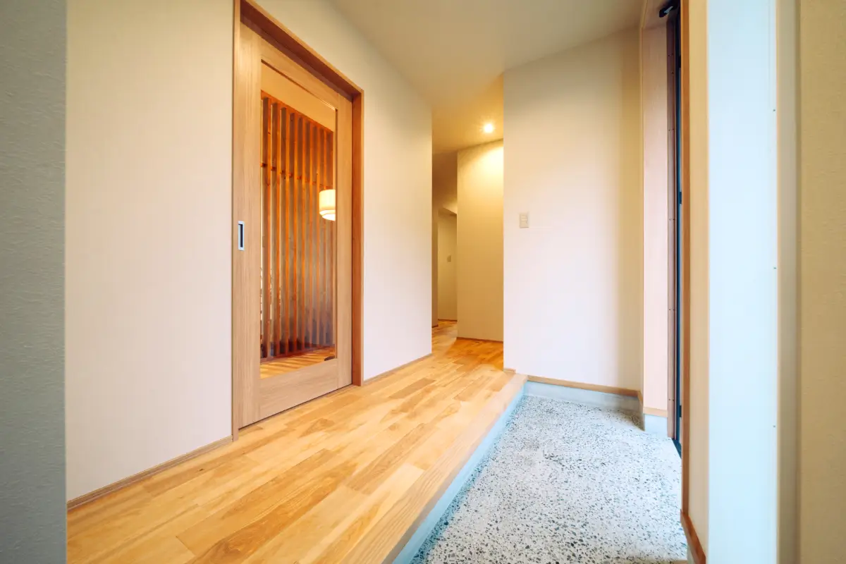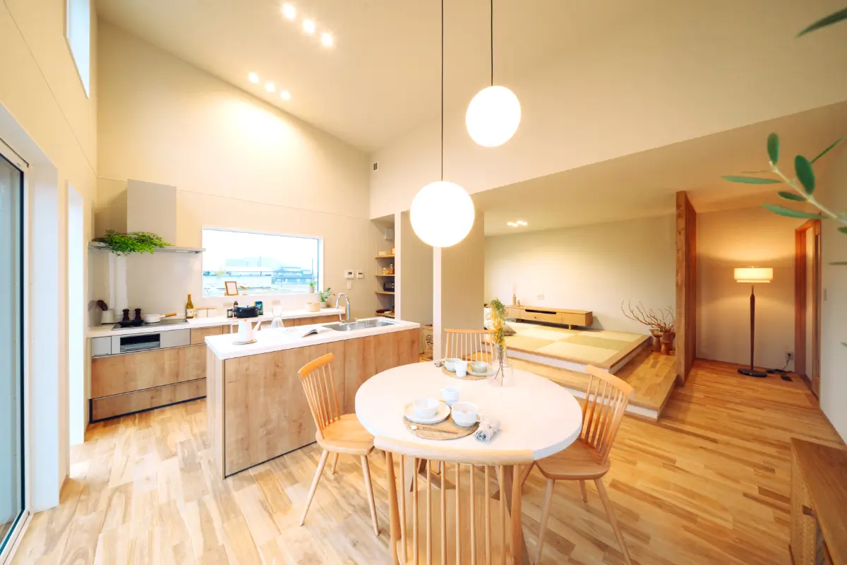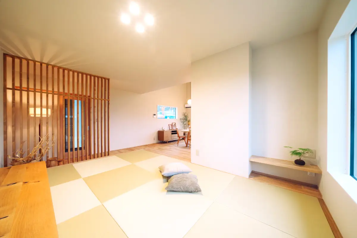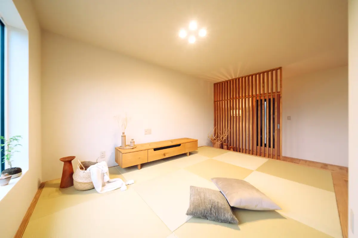 リビングの格子や畳、玄関の土間など、和の要素が随所に散りばめられ、モダンなデザインとの調和が見事に成されています。