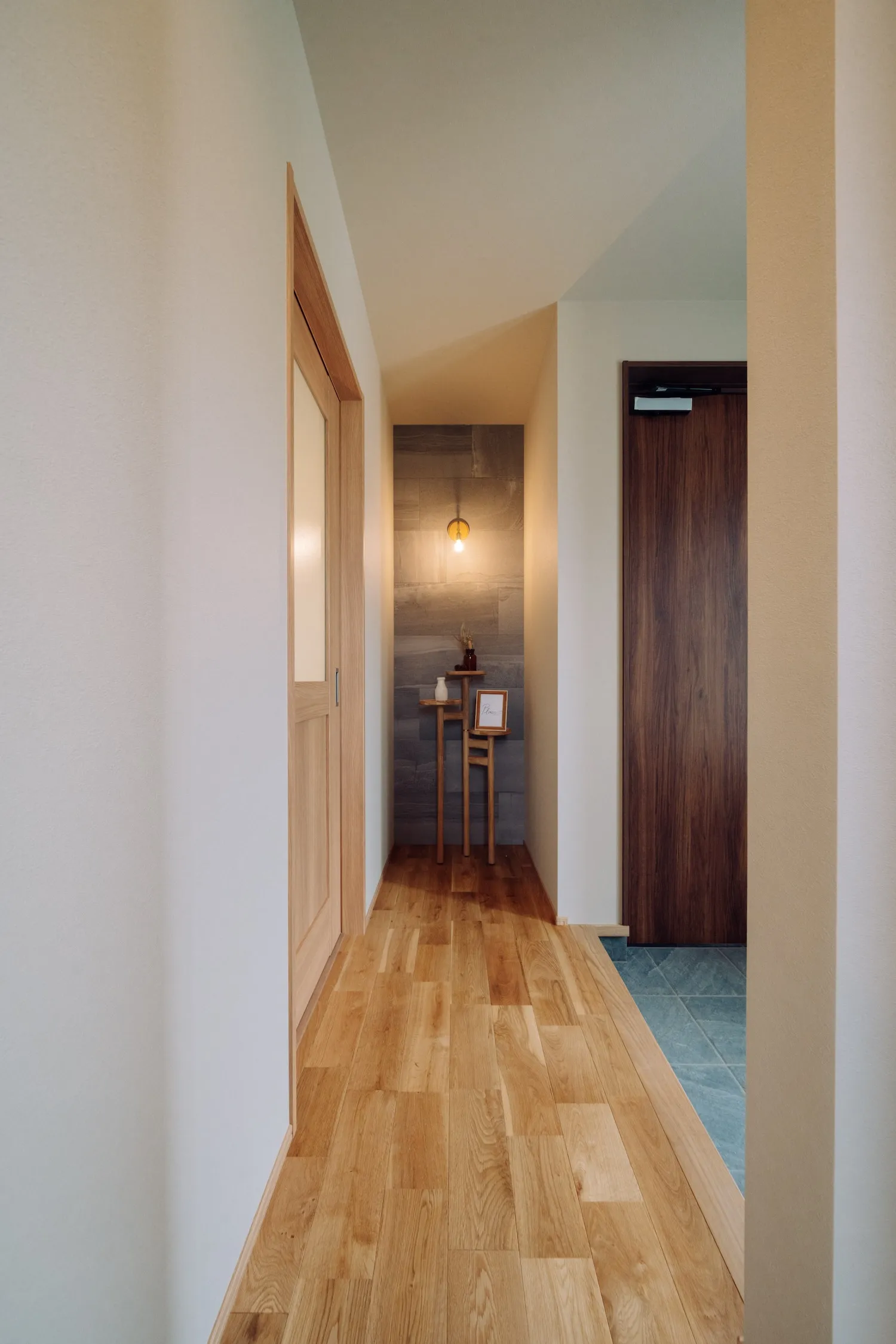 玄関では、温かみのあるブラケットランプが「好きなもの」を照らします。
