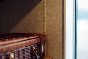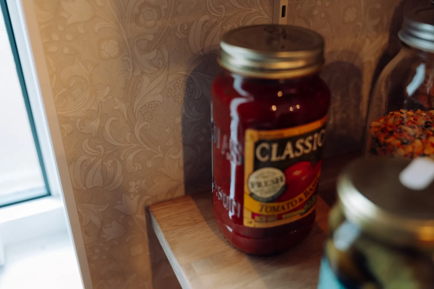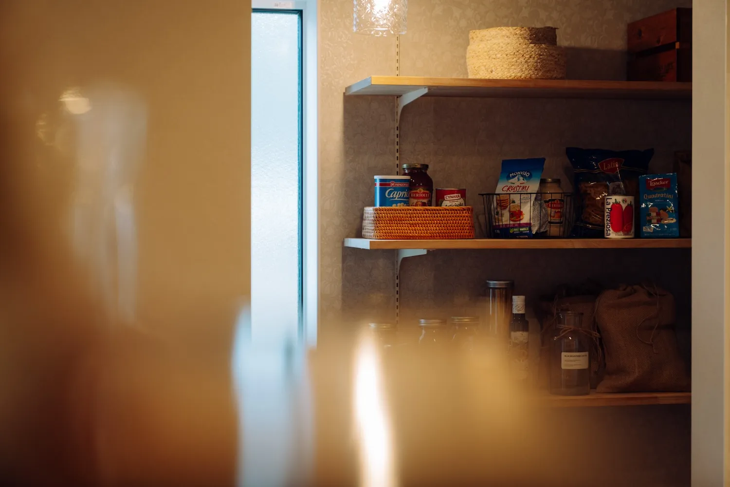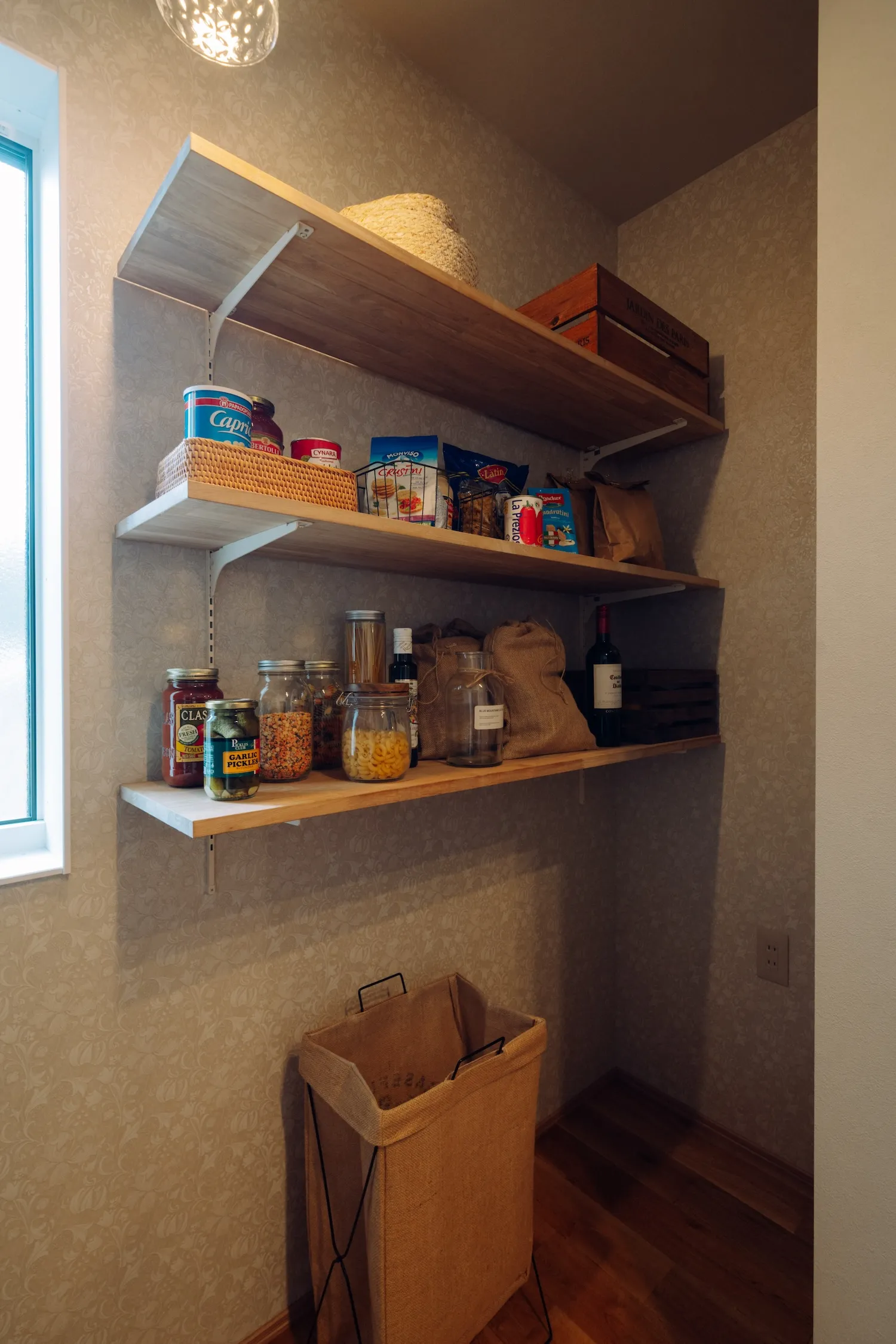 アンティーク模様のクロスと、繊細な模様を施したガラスのペンダントライトでパントリーが表情豊かに。