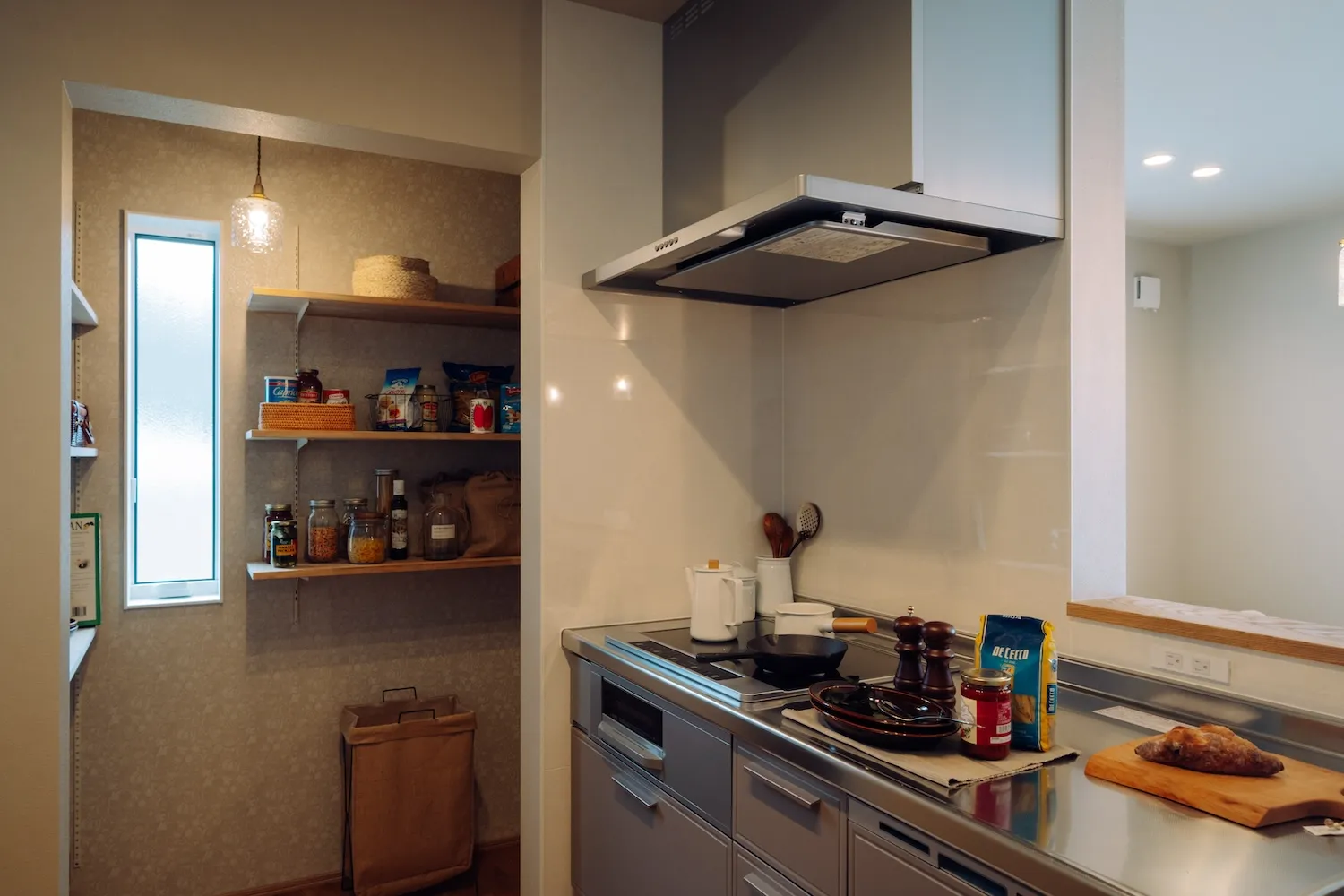 キッチン背面には、奥様が一目惚れした食器やティーカップを飾るディスプレイ棚を設けました。
