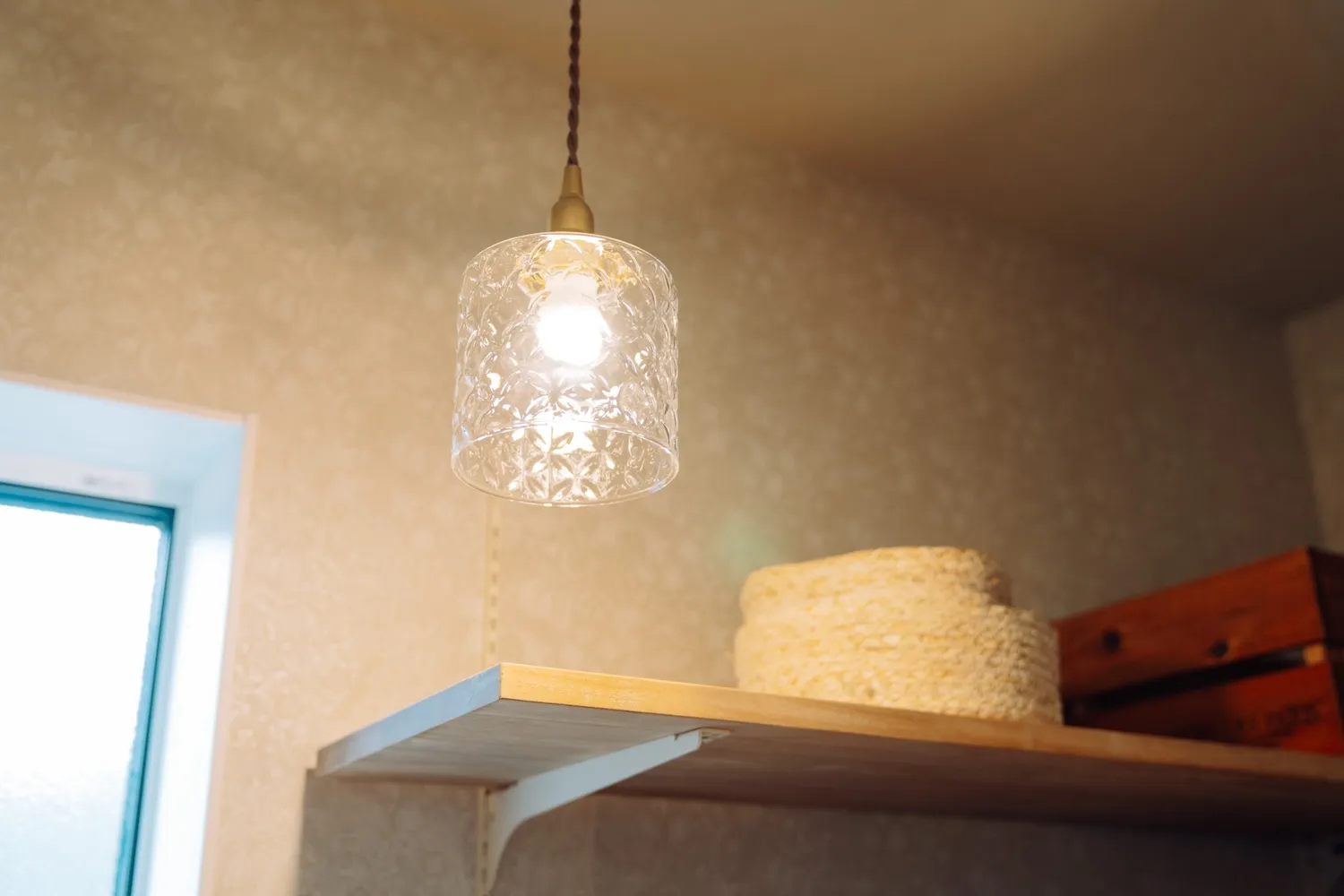 キッチンにはガラスが煌めくペンダントライトをぶら下げ、奥様の気分が上がる空間になりました。