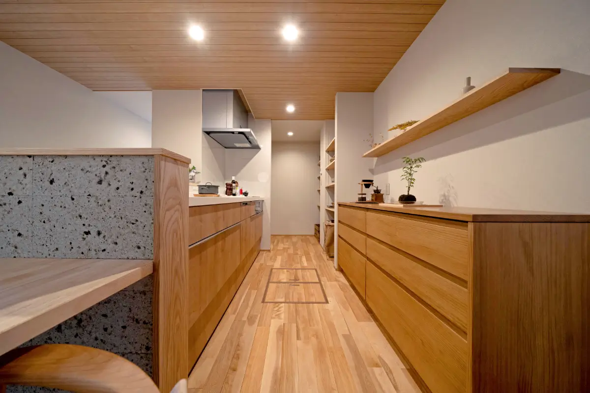 板張りの天井はあえて低くし、おこもり感のある居心地の良さを感じさせます。