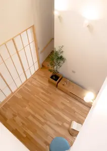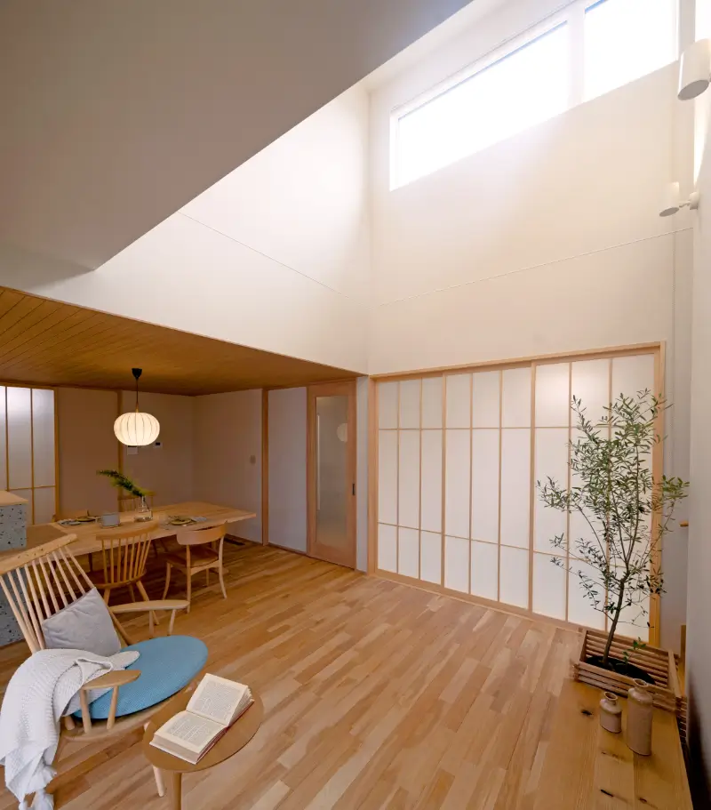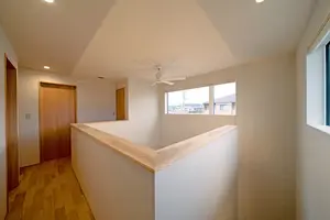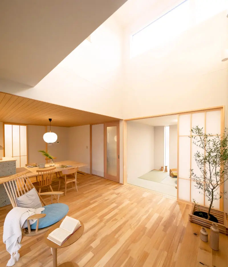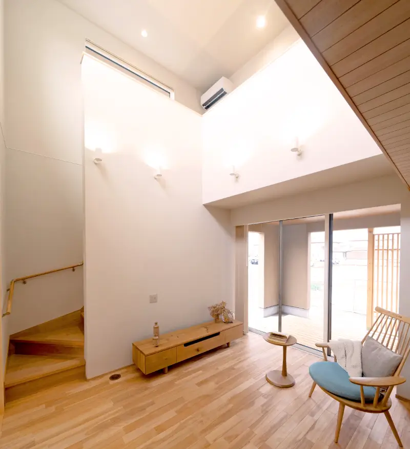 高い吹き抜けから注がれる光が、家に明るさと広がりを与えます。