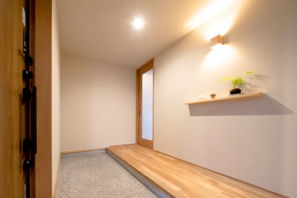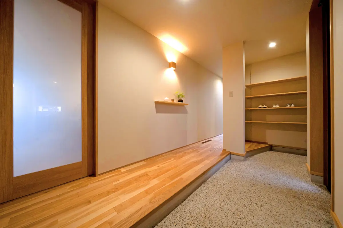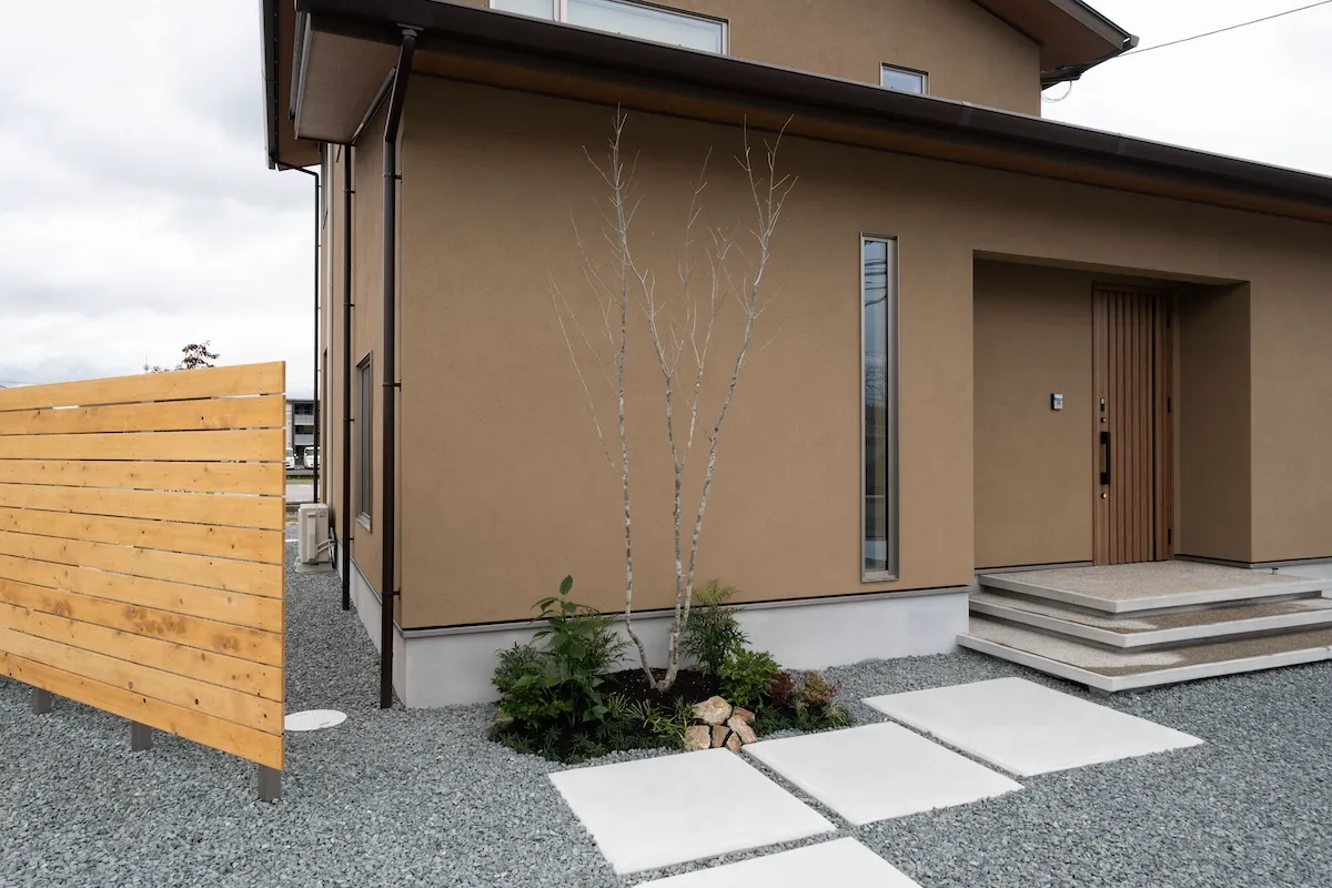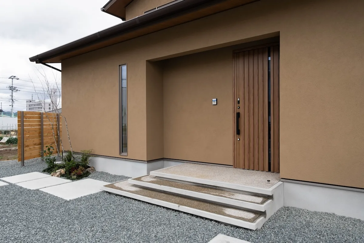 玄関に使用した千鳥砂利の洗い出しは、控えめで上品な印象を与えます。