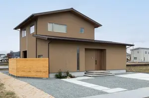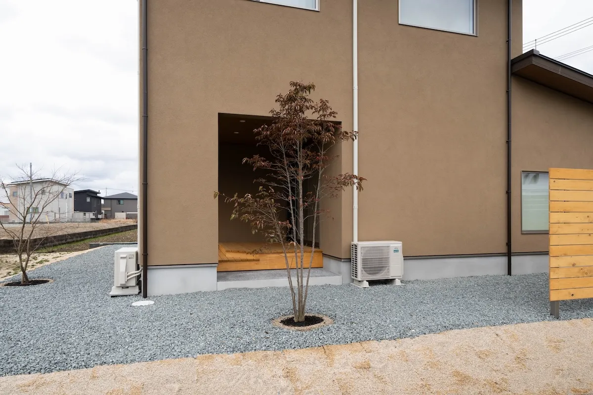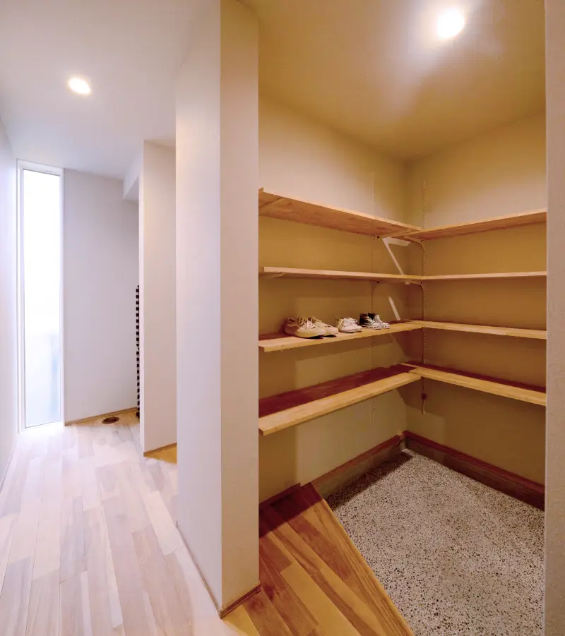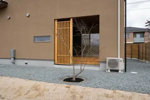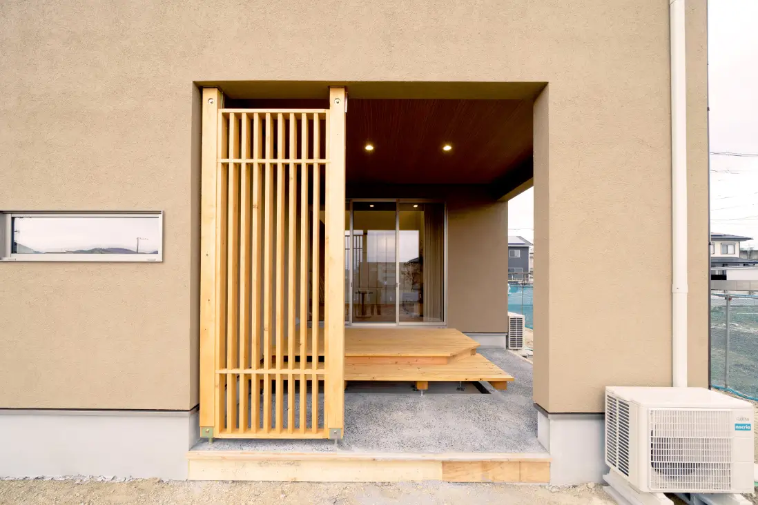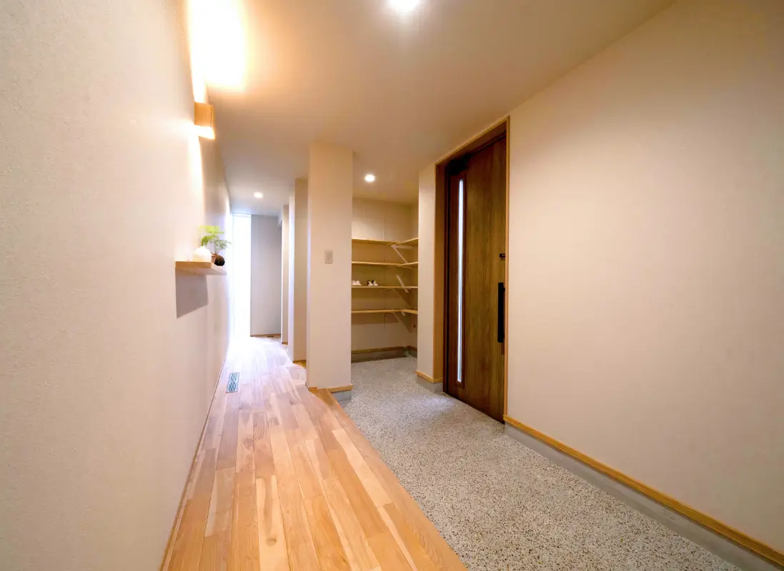 玄関に使用した千鳥砂利の洗い出しは、控えめで上品な印象を与えます。