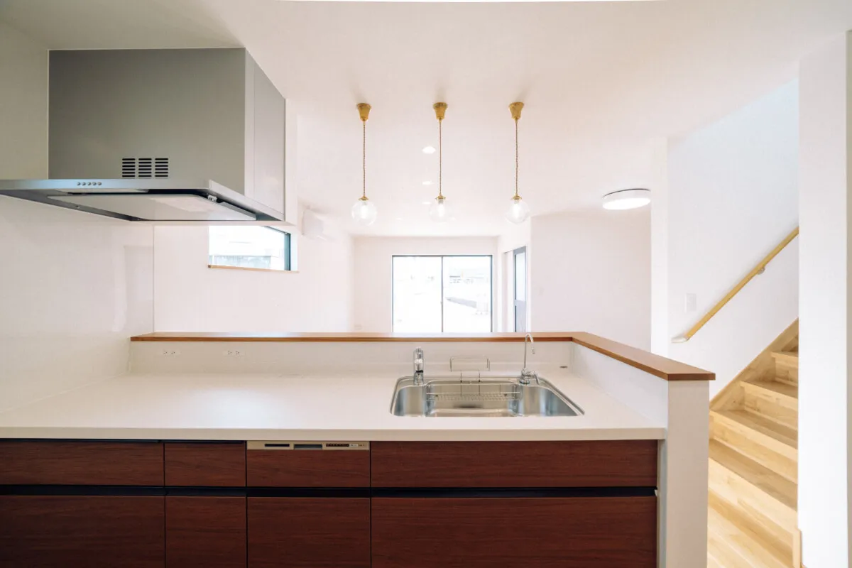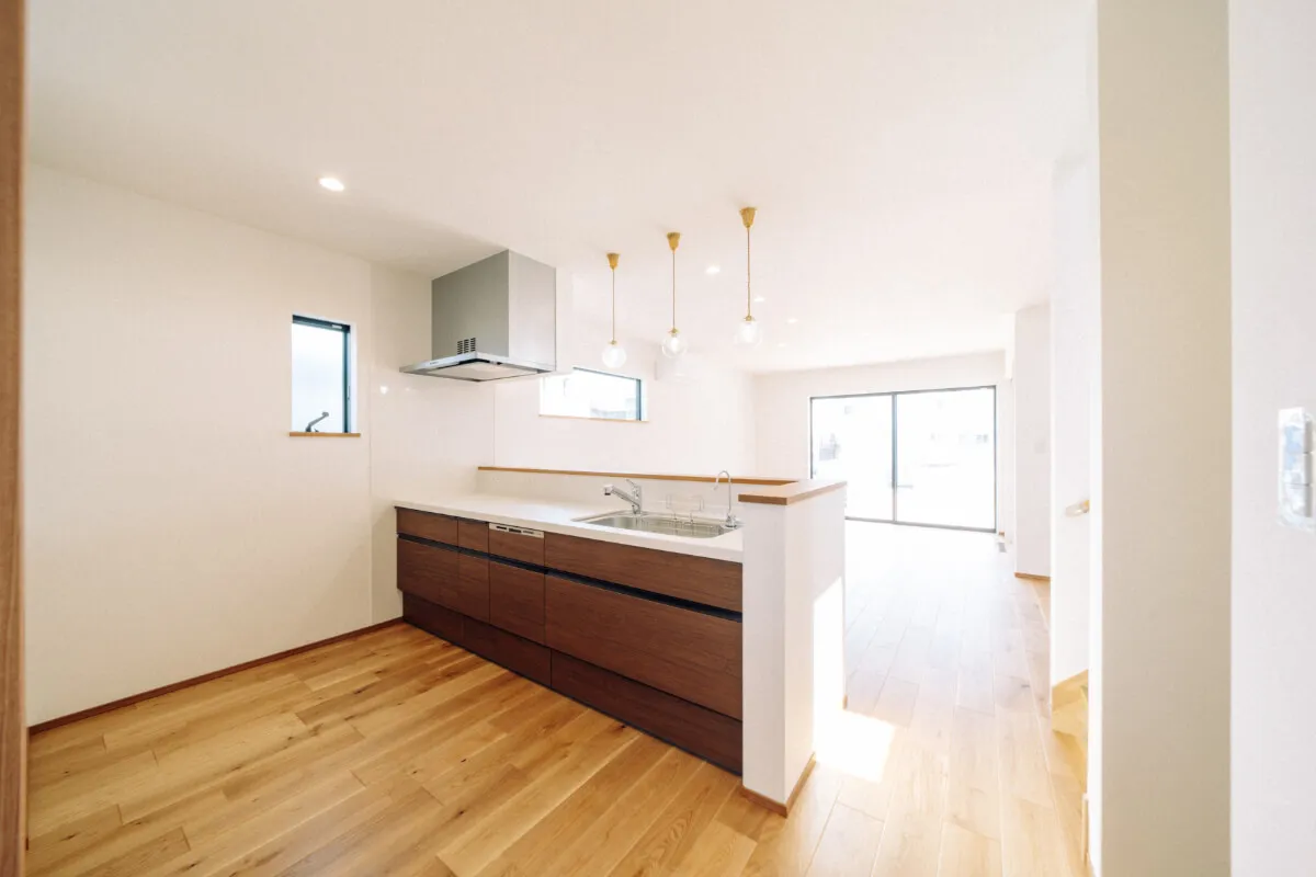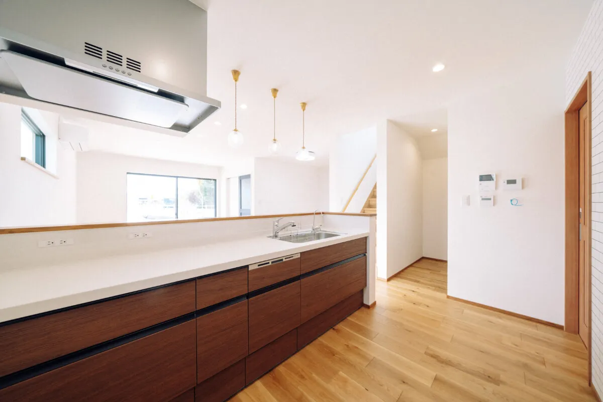 木目調ブラウンカラーのオープンキッチン。