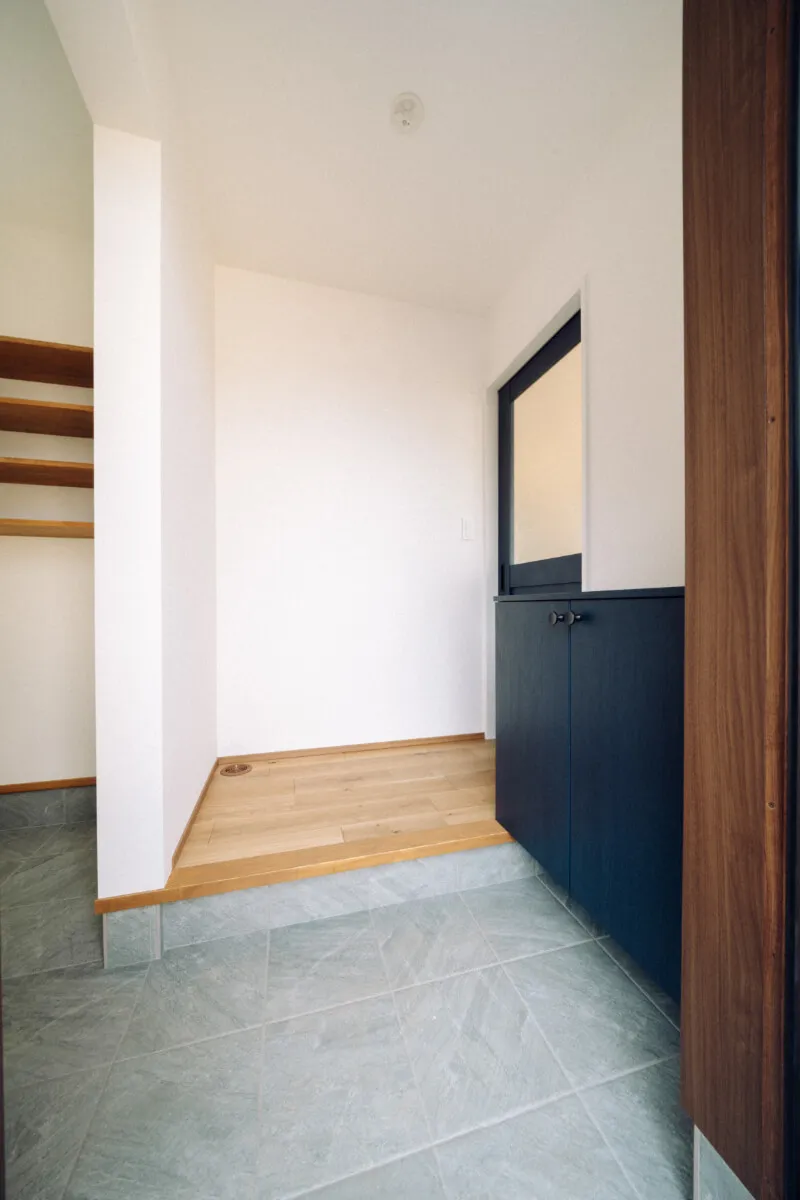 玄関には、限られたスペースの中でも土間収納と収納ラックをしっかり確保し、