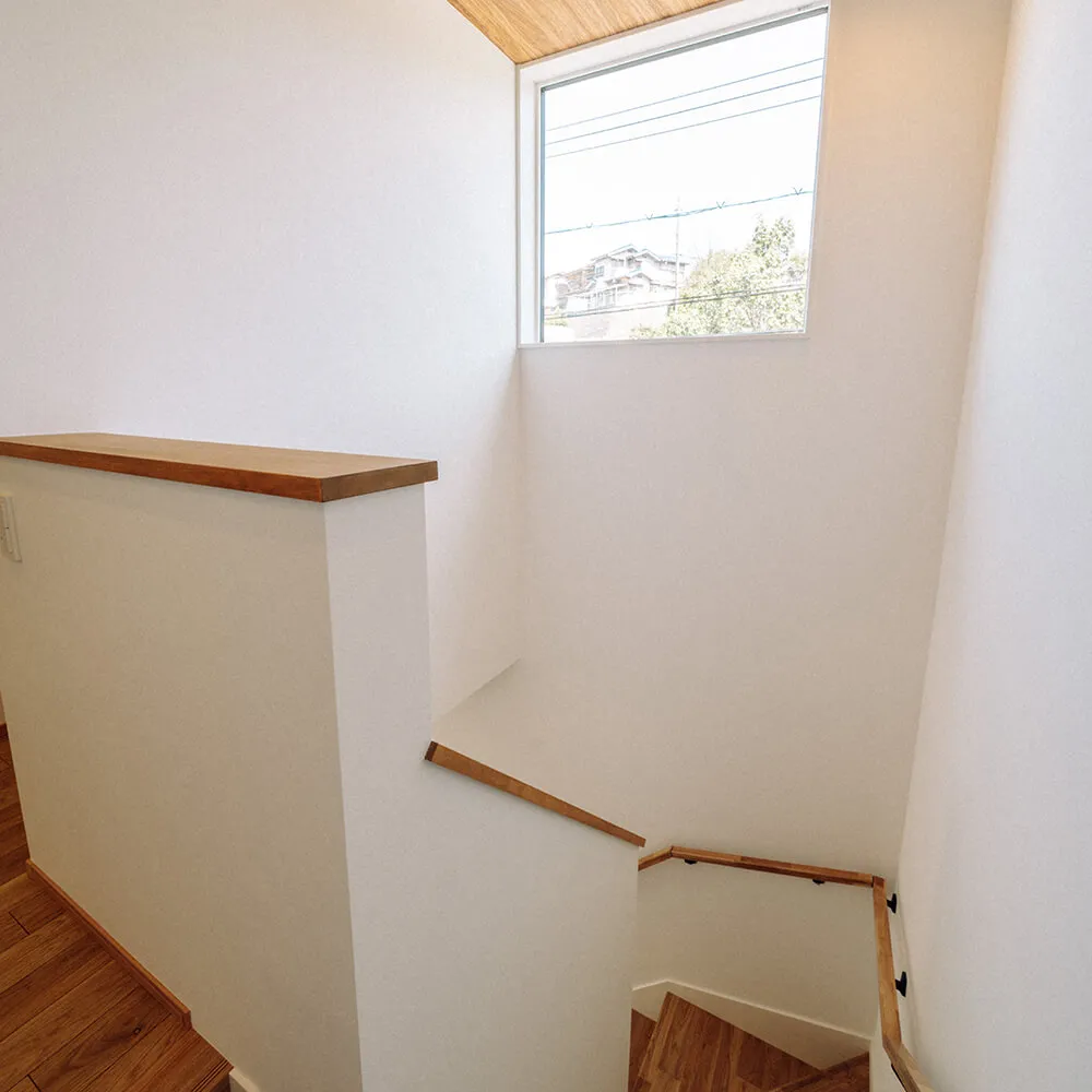 暗くなりがちな階段にも大きなFIX窓を配置することで日が差し込む空間になっています。