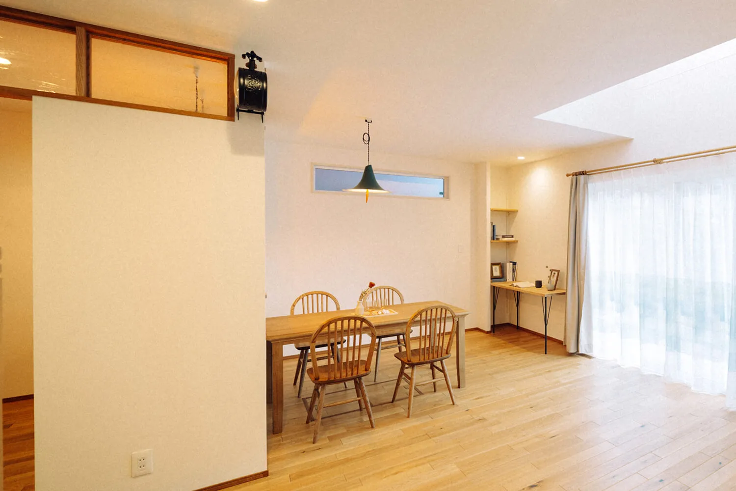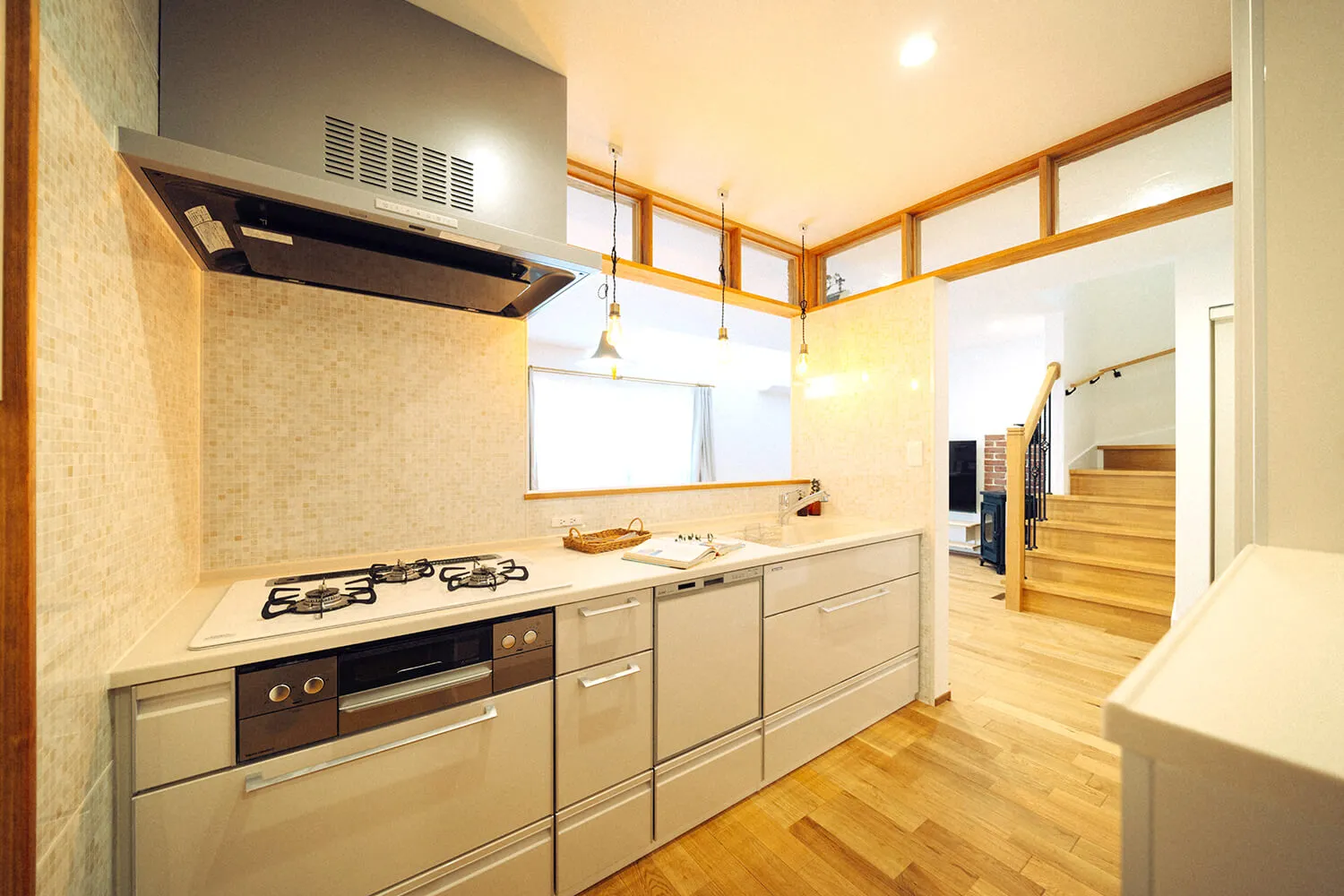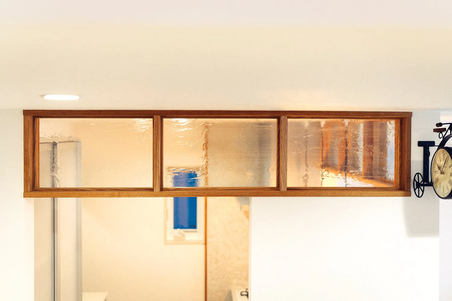 囲み上部の磨りガラスの洋風欄間で、おしゃれな自宅カフェ風のキッチンダイニングになりました。