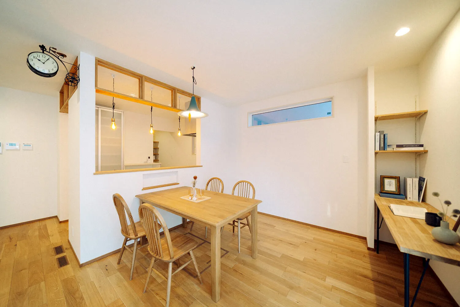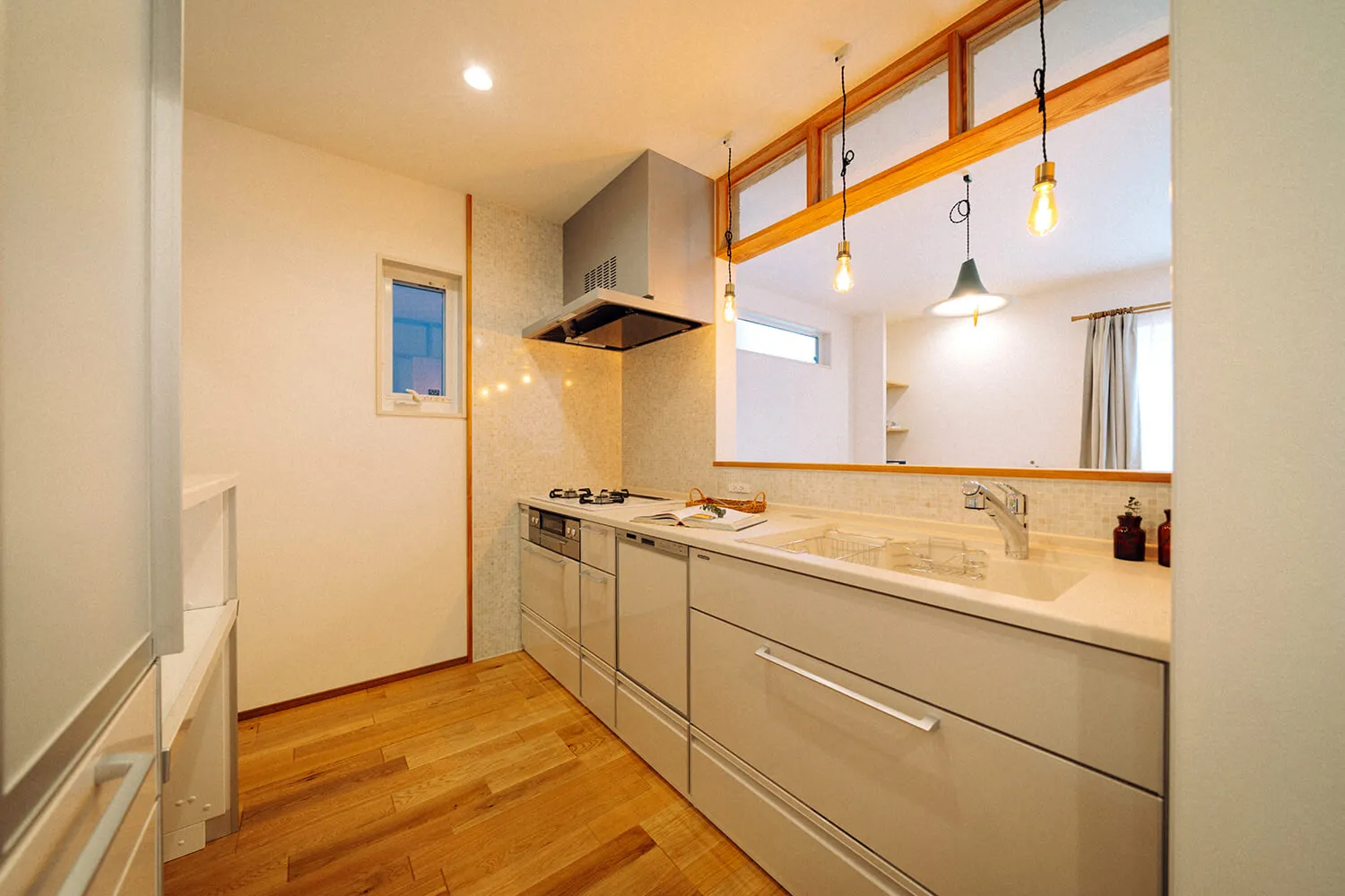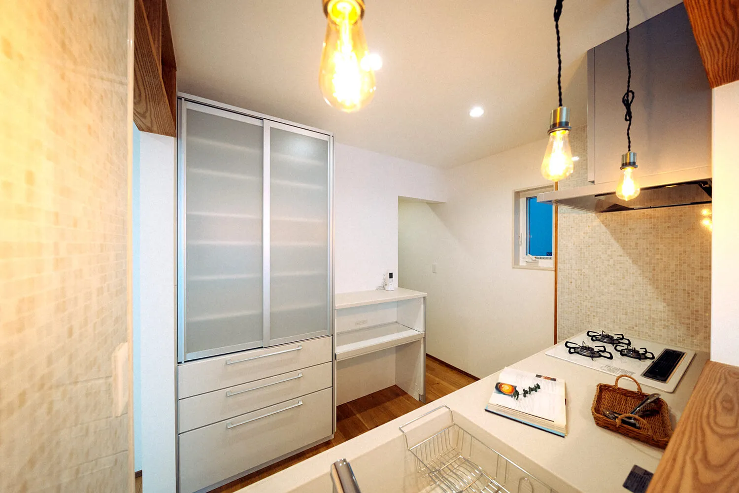 囲み上部の磨りガラスの洋風欄間で、おしゃれな自宅カフェ風のキッチンダイニングになりました。