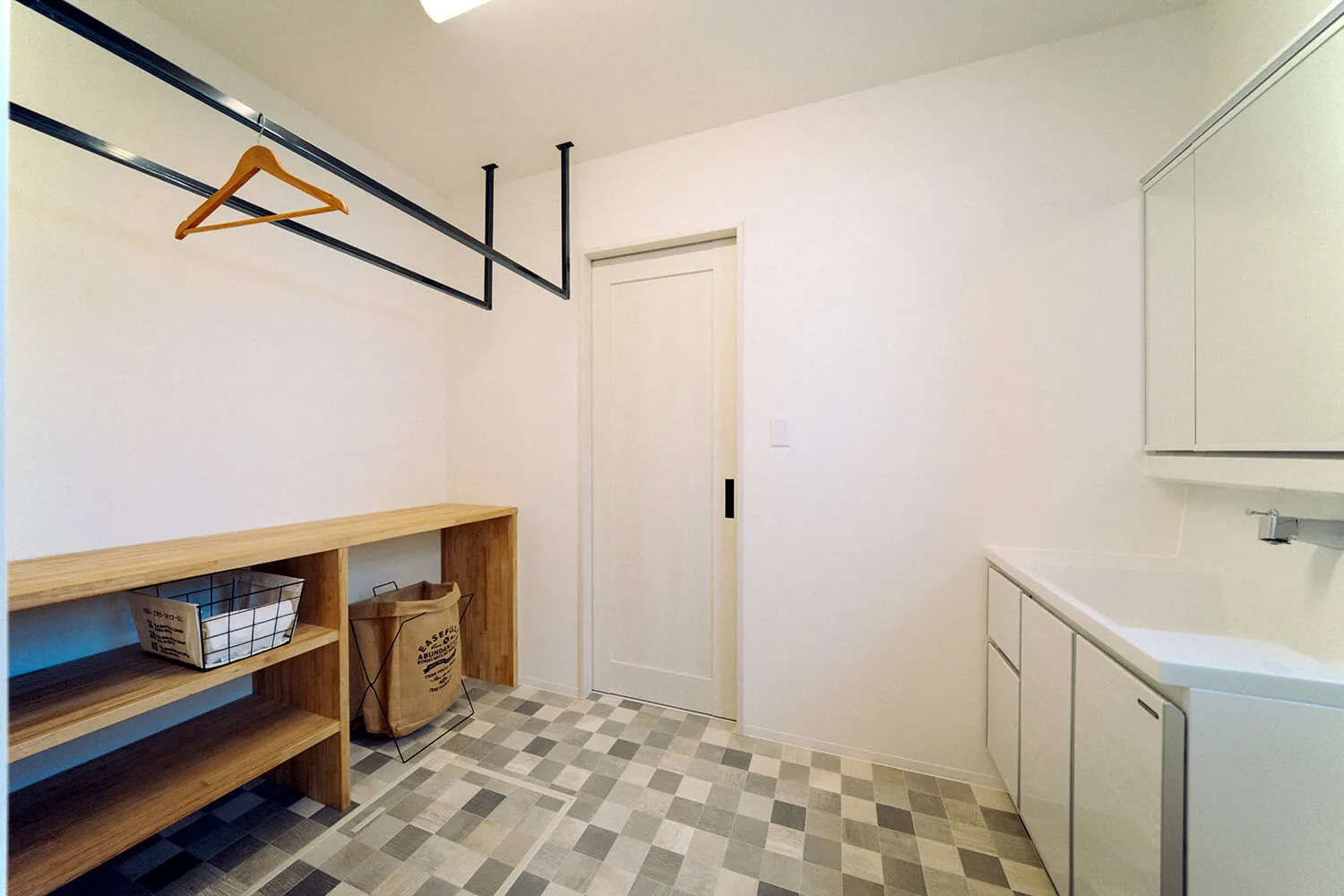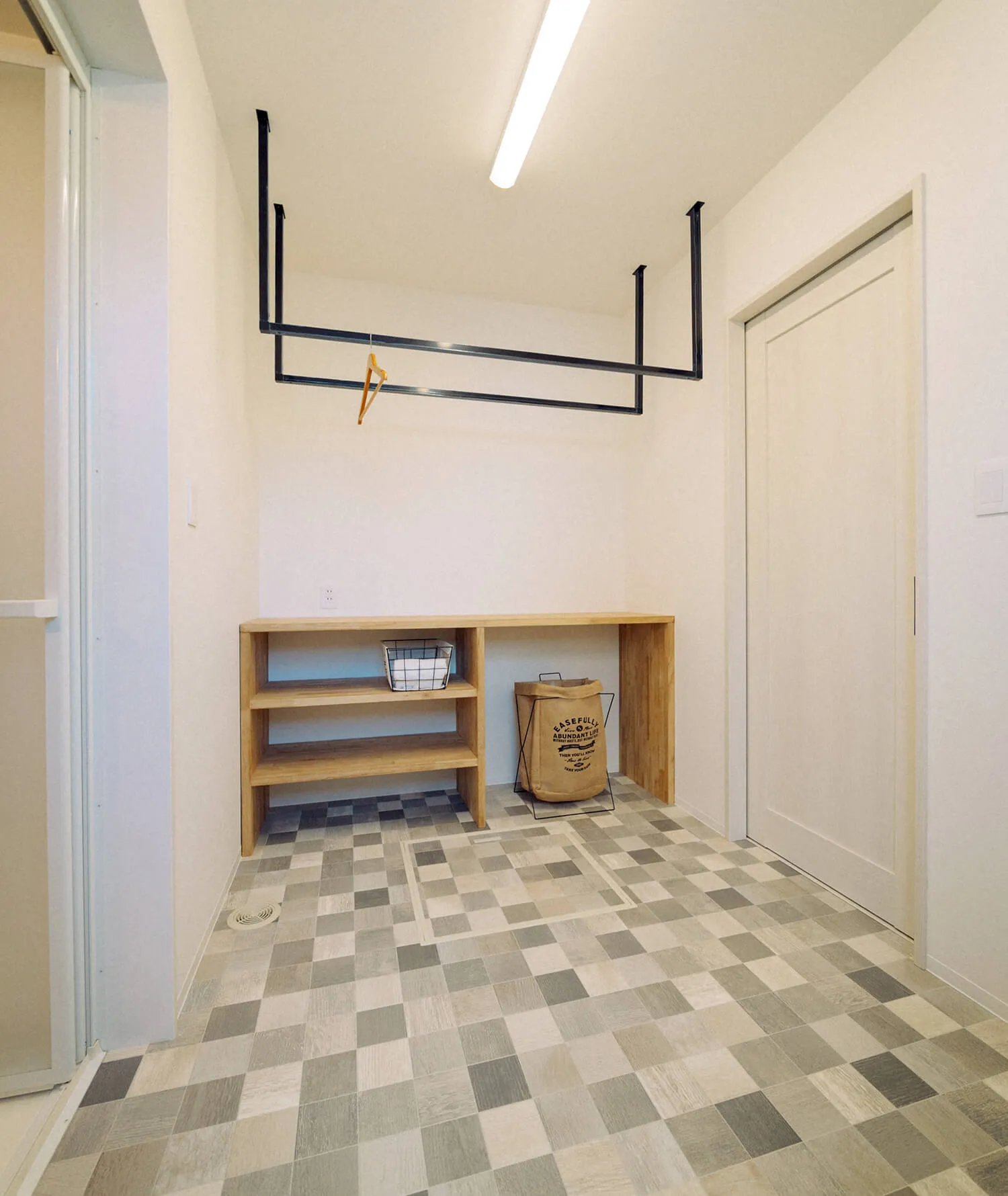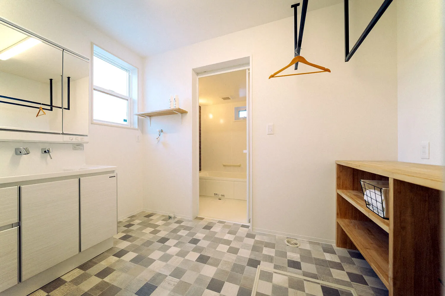 洗面所の脱衣スペースには室内物干しができるようになっています。