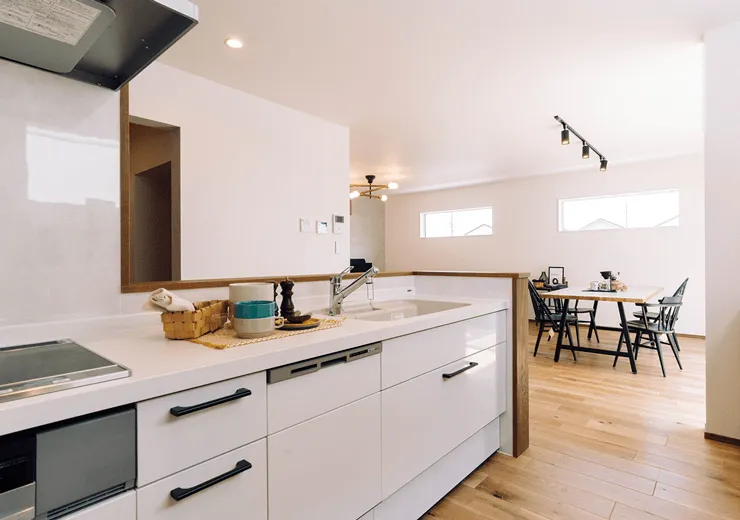 キッチンとダイニングテーブルを横並びにすることで、配膳と片付けが横移動だけで楽ちんに。