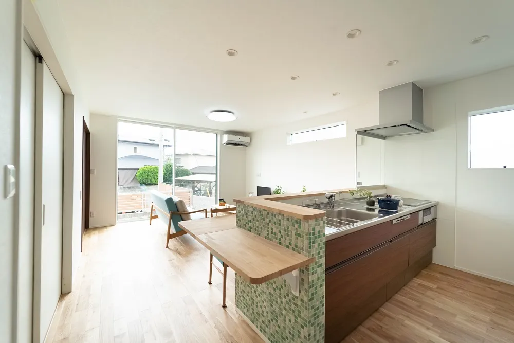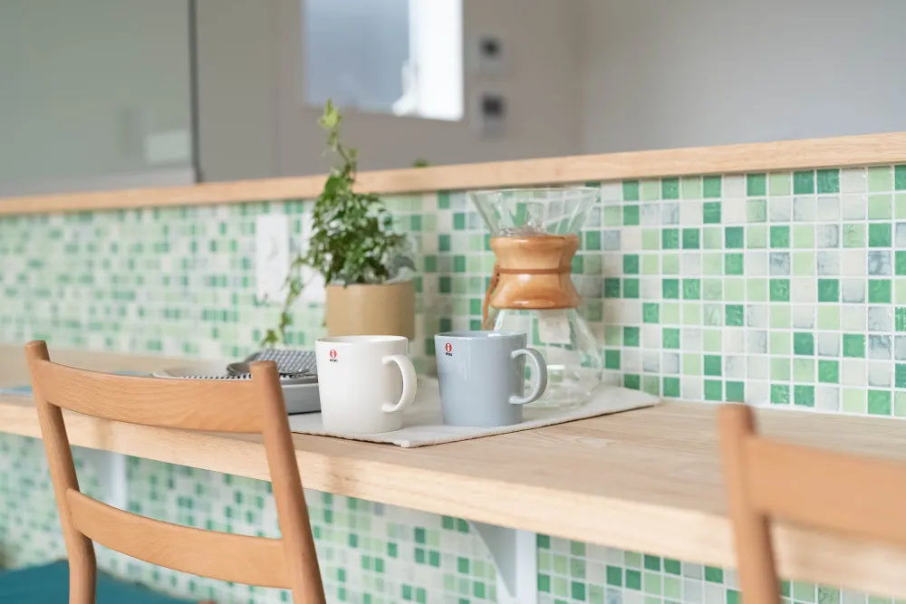 可愛らしいモザイクタイルがアクセントのカウンターテーブルは食卓に彩りを添えてくれ、料理だけでなく家族との会話の時間も楽しめるように、毎日使う場所だからこそ、お母さん目線で考えたこだわりの空間に仕上がった。