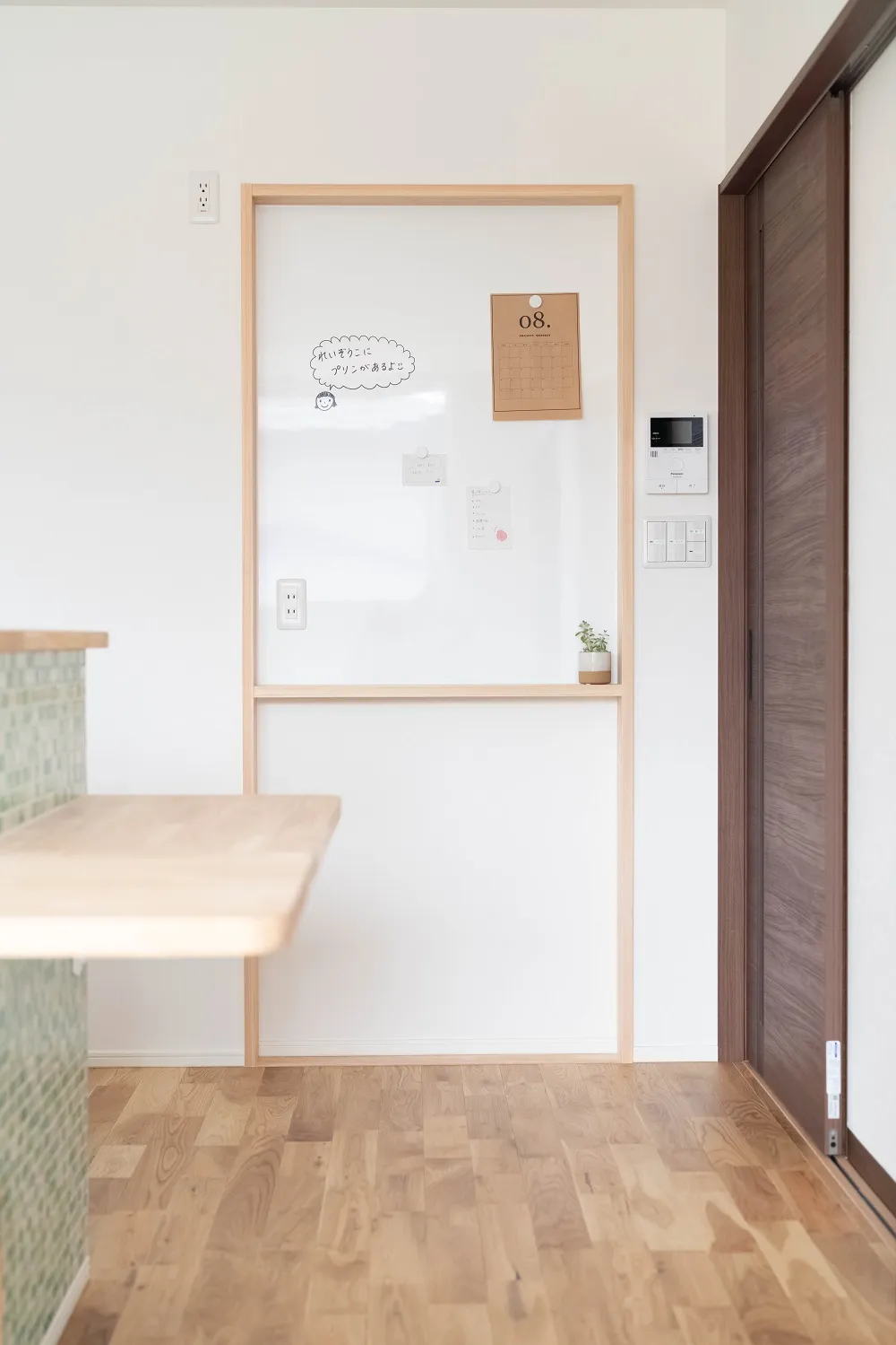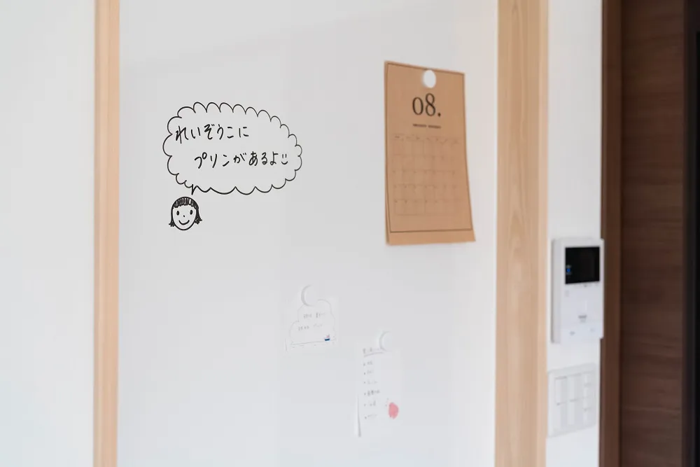 家族の動線が交差する場所にホワイトボードとマグネットパネルを備えたニッチがあることで家族のコミュニケーションの場として使われ、いつでも家族を感じられるオープンな住まいを実現した。