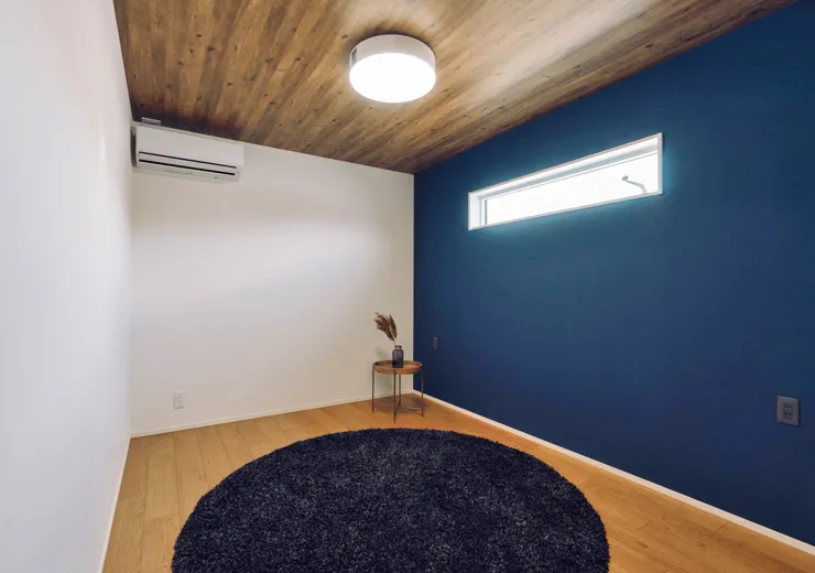 ネイビーのアクセントクロスと木目天井で落ち着く空間に。