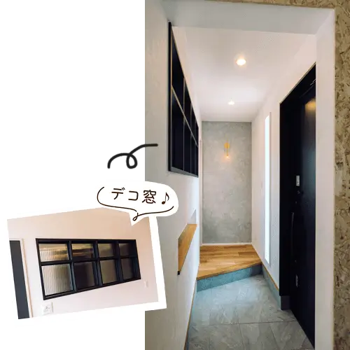 玄関を入ってすぐ目に入るのは、窓枠の色やガラスの種類などたくさんのこだわりが詰め込まれた、存在感のあるデコ窓。