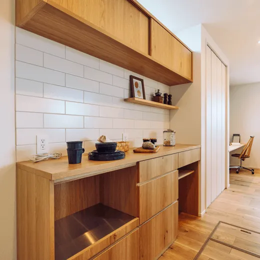 子供たちはワークスペースで宿題、お父さんはパソコンで作業、すぐそばではキッチンからお母さんがみんなを見渡せる。