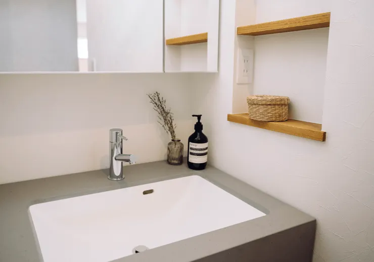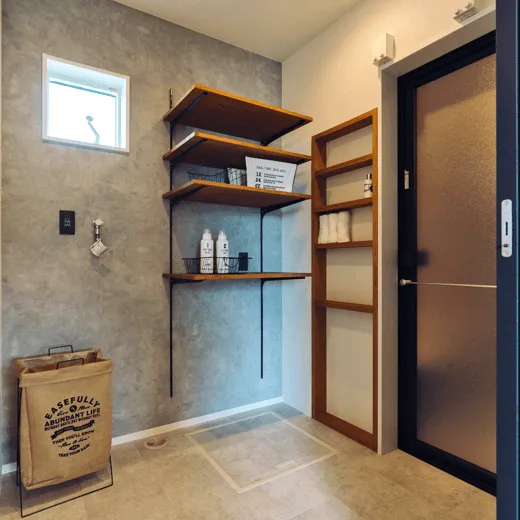 誰かがお風呂に入っていて洗面所を使えない!ということがないよう、脱衣室と洗面所を別々にすることで実用的に。