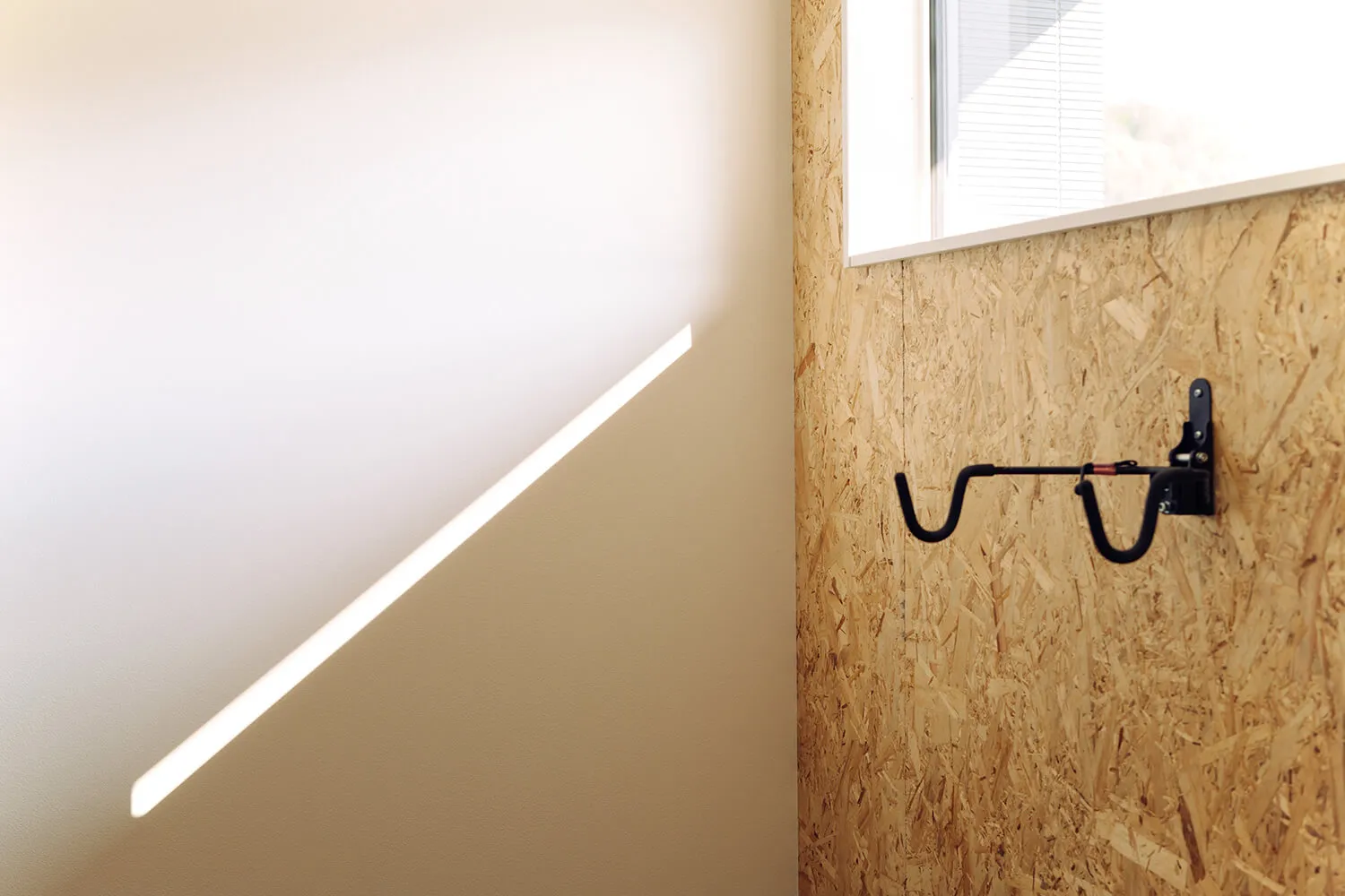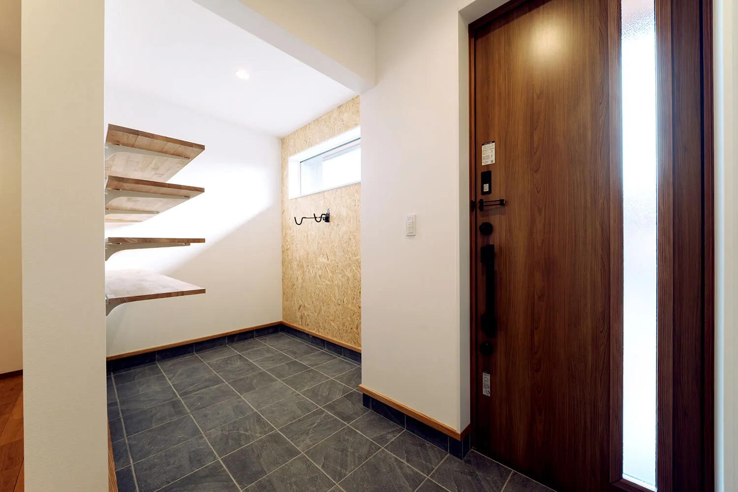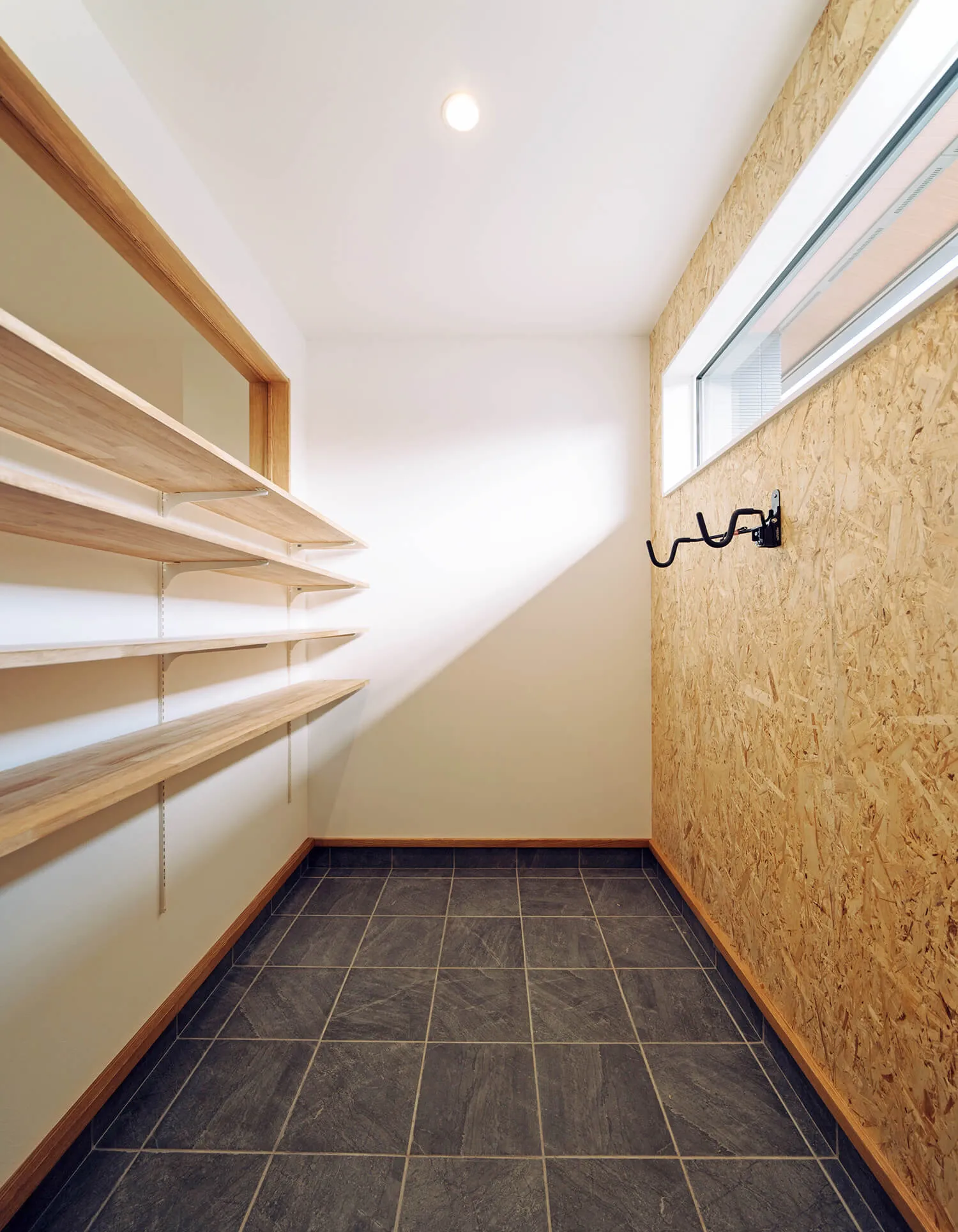 玄関横には可動棚と、合板張りの壁にバイクハンガーを設置した土間収納。