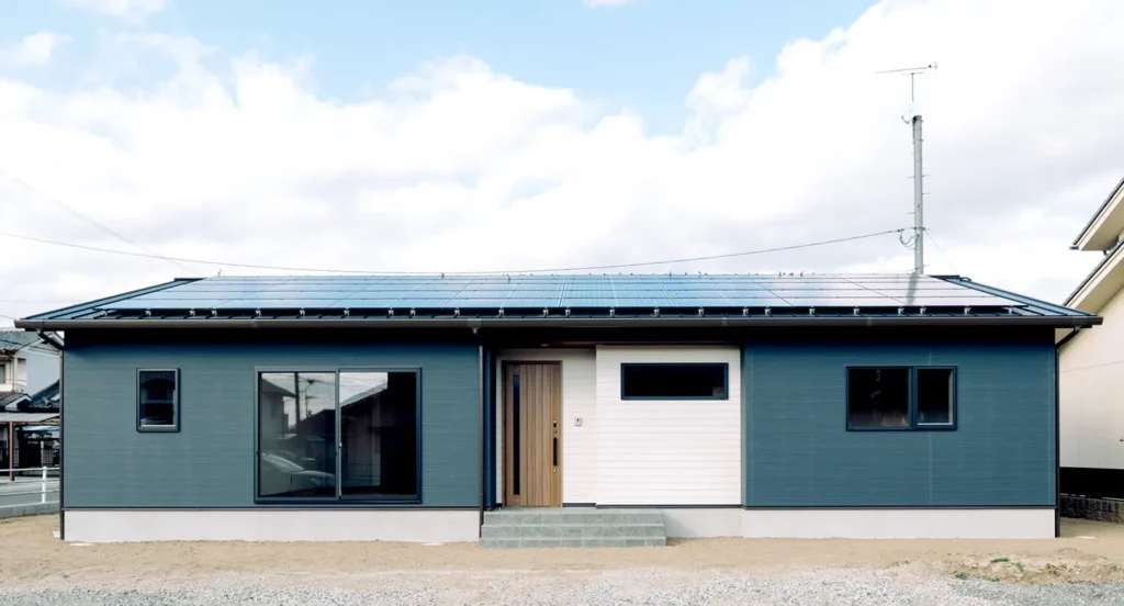 平屋の広い屋根には太陽光発電を搭載し、エコで高性能なお家です。