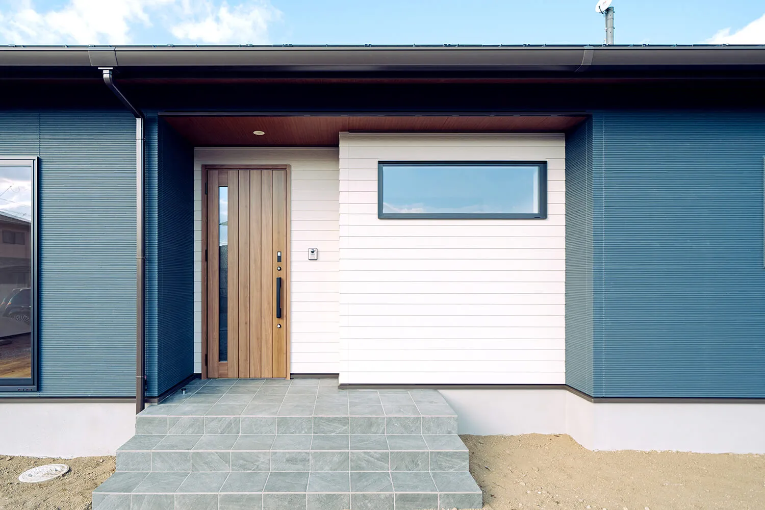 シックな外観の中に、木目の玄関ドアがアクセント。