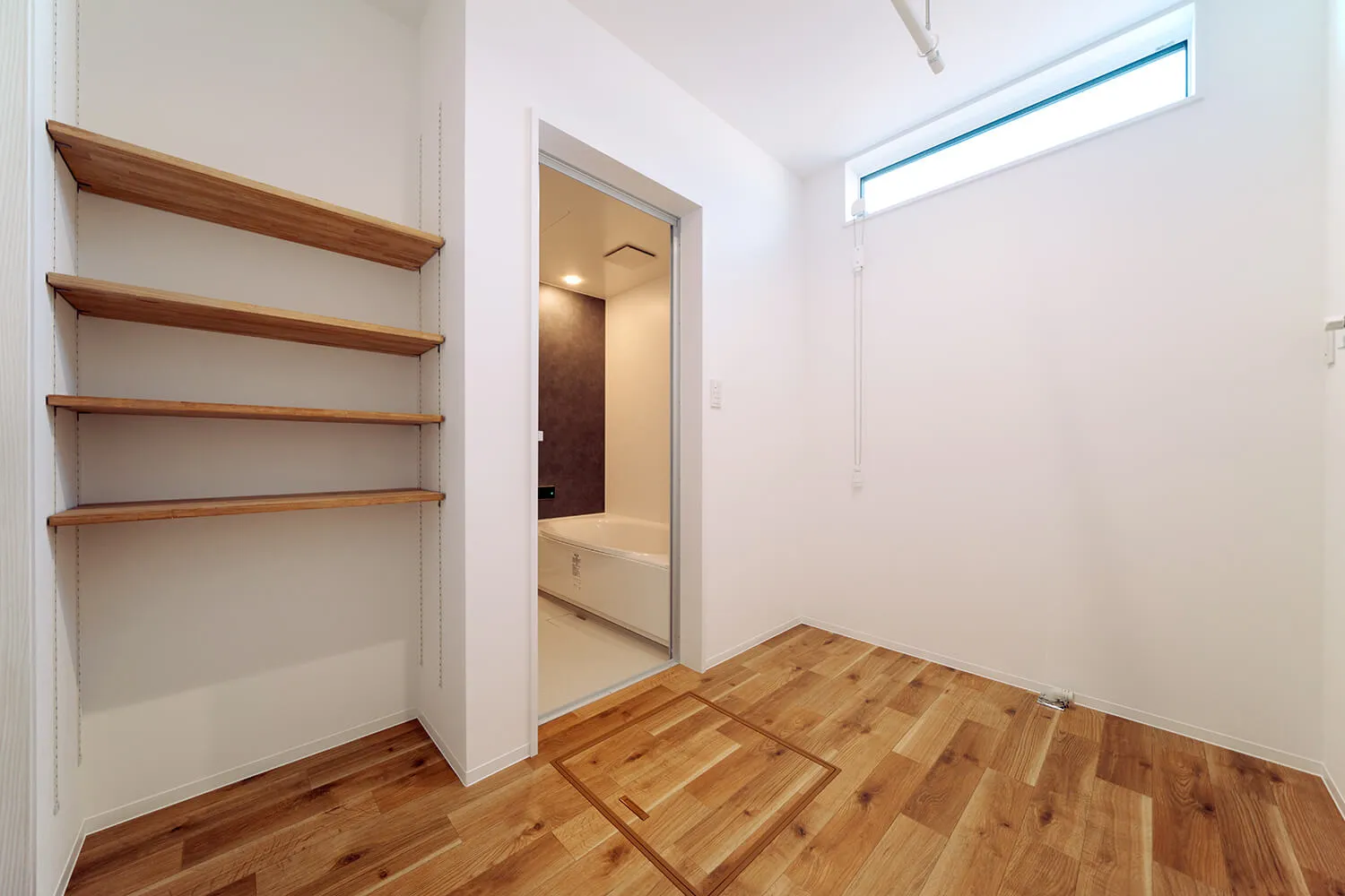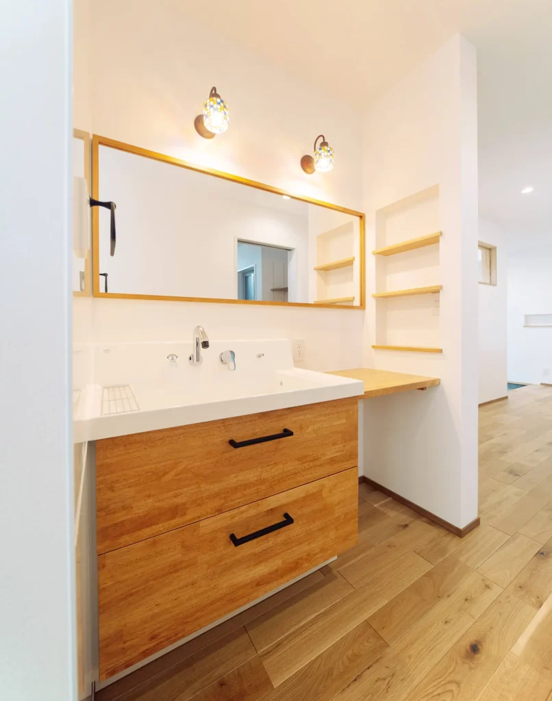 脱衣所の棚は可変になっているので、用途に応じて高さが調整可能。