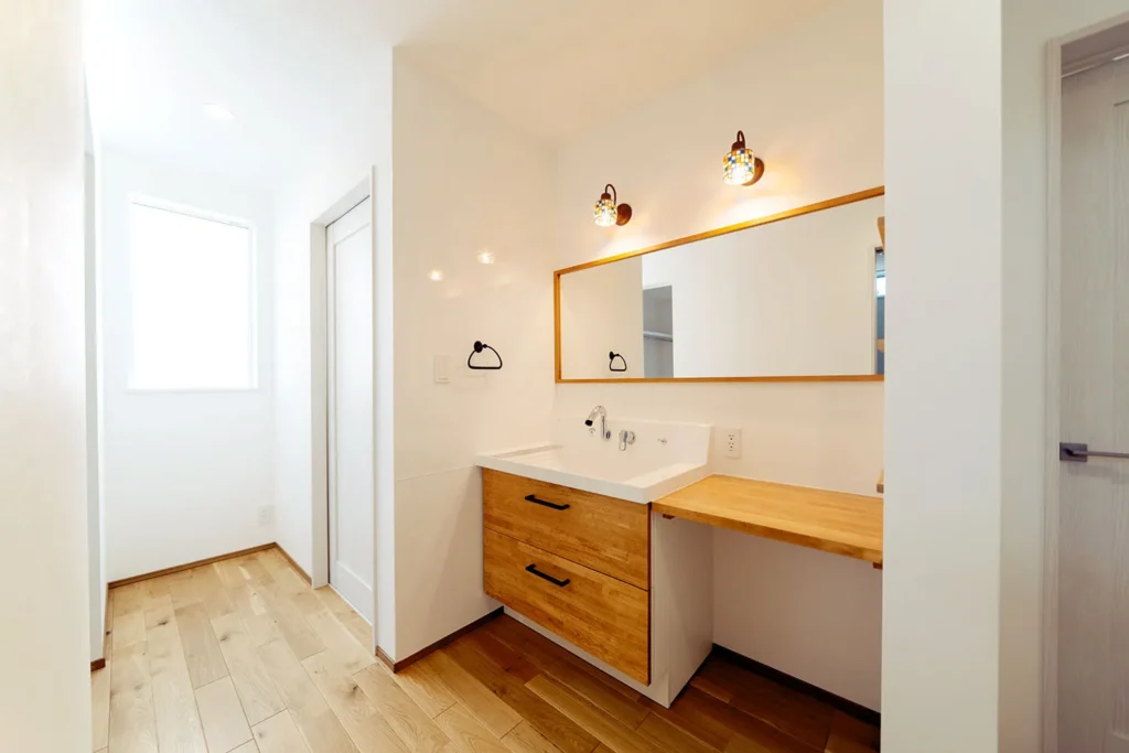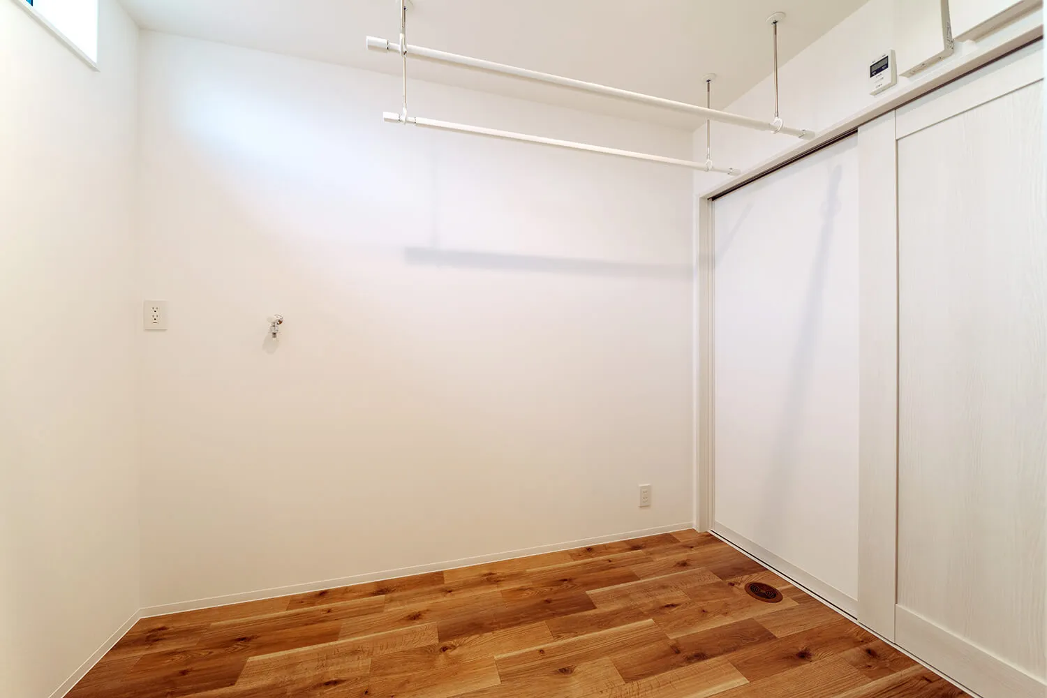 バスルーム手前の脱衣所には、室内物干しを設けて、洗濯物がすぐ干せるようになっています。