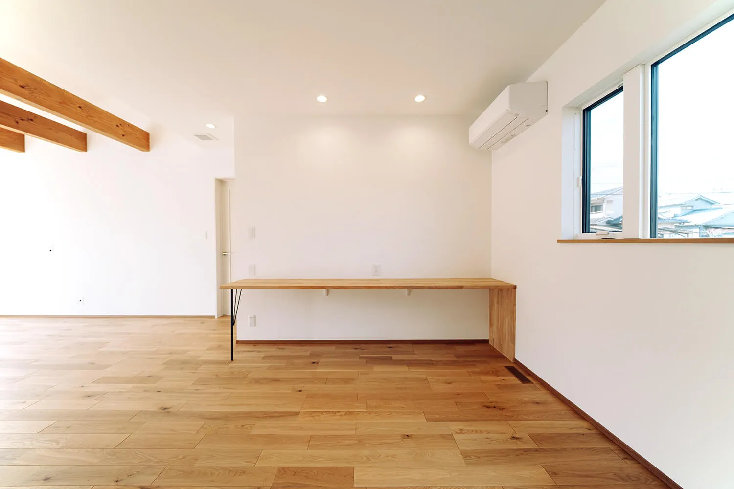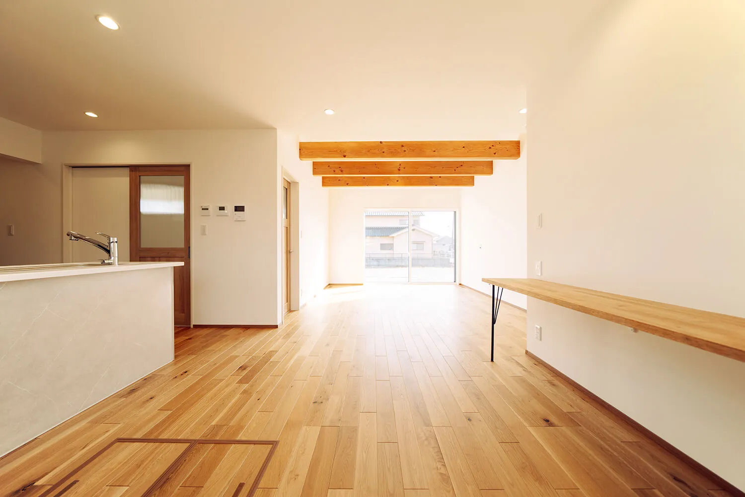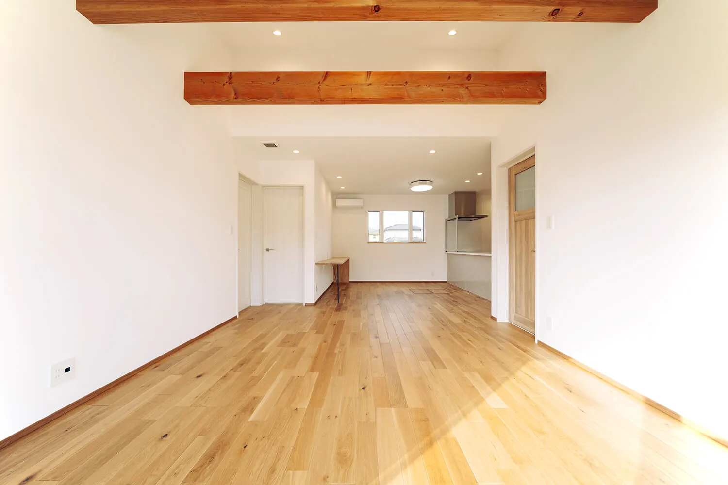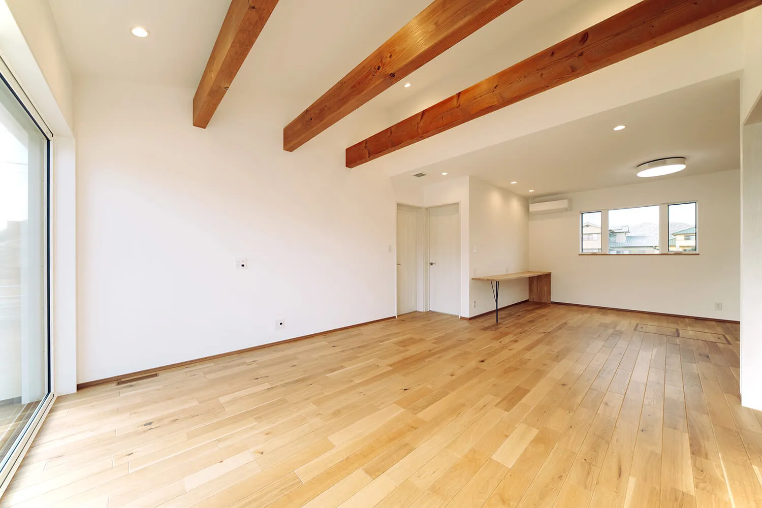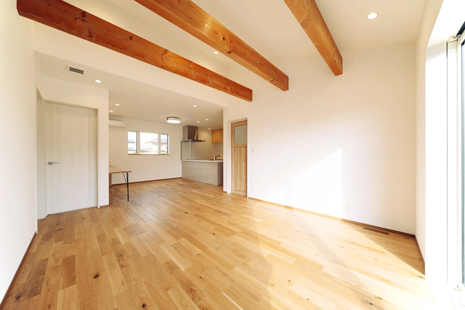 広いリビングの天井にはアクセントに木の梁を。