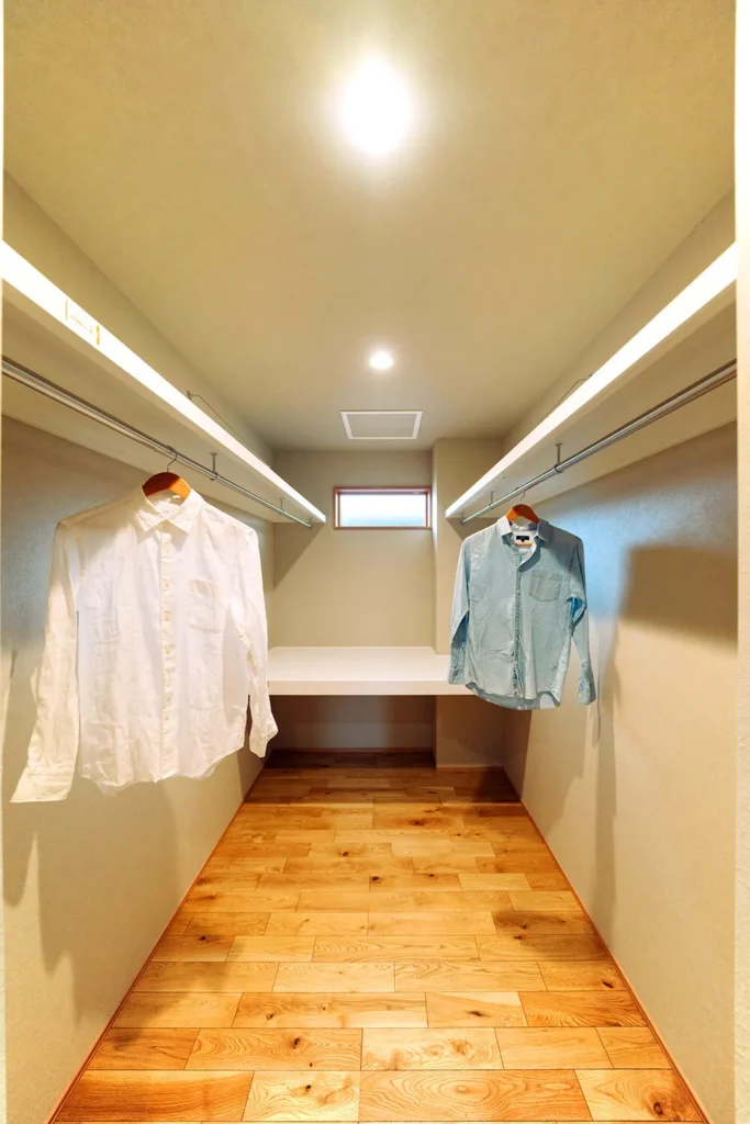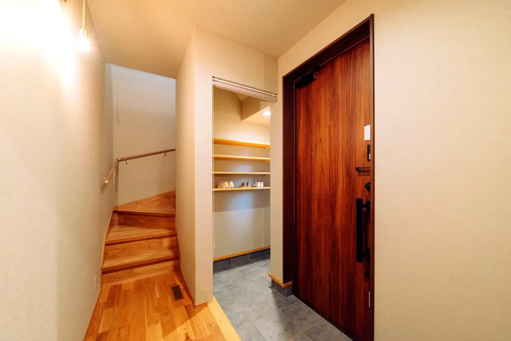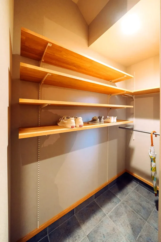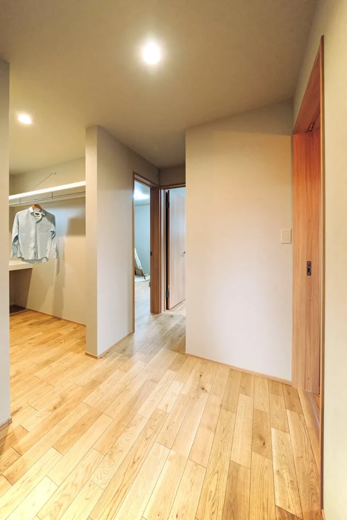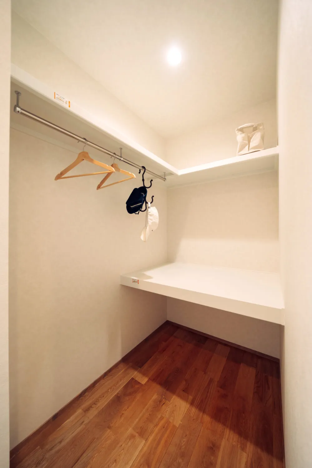 シューズクローク→洗面室→支度スペース→リビング。帰宅後やお出かけ時もスムーズな動線ができました。2畳の広さでお出かけに必要なかばんや上着をラクラク収納。