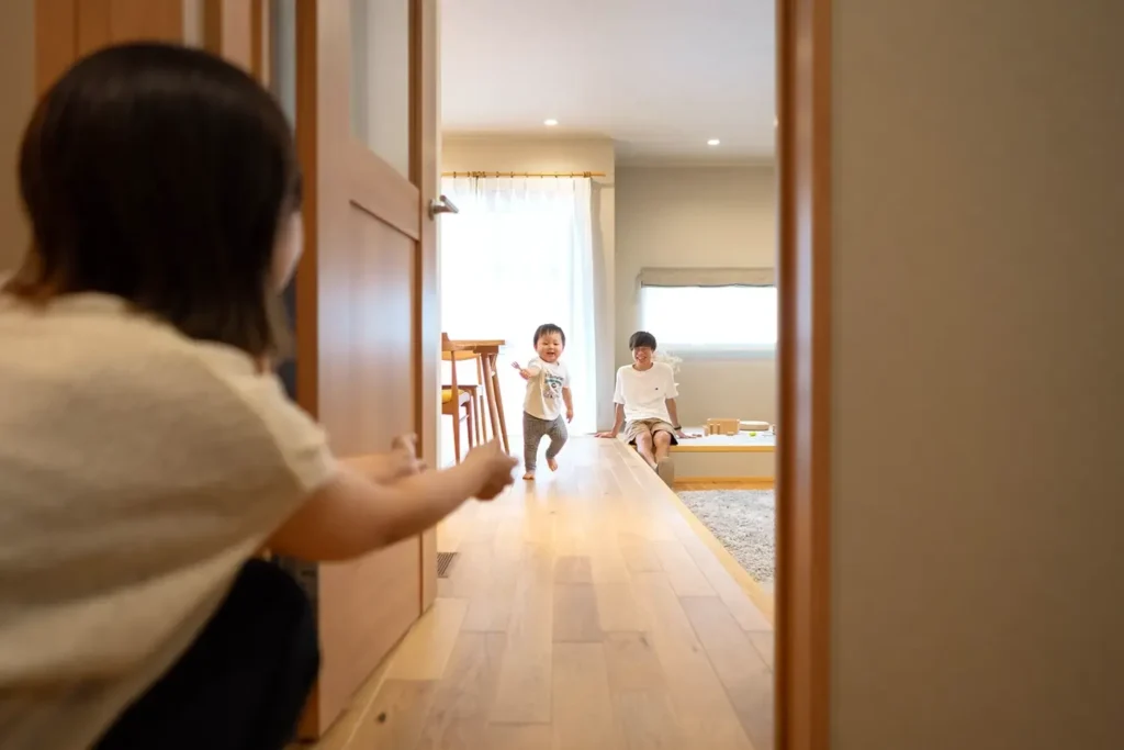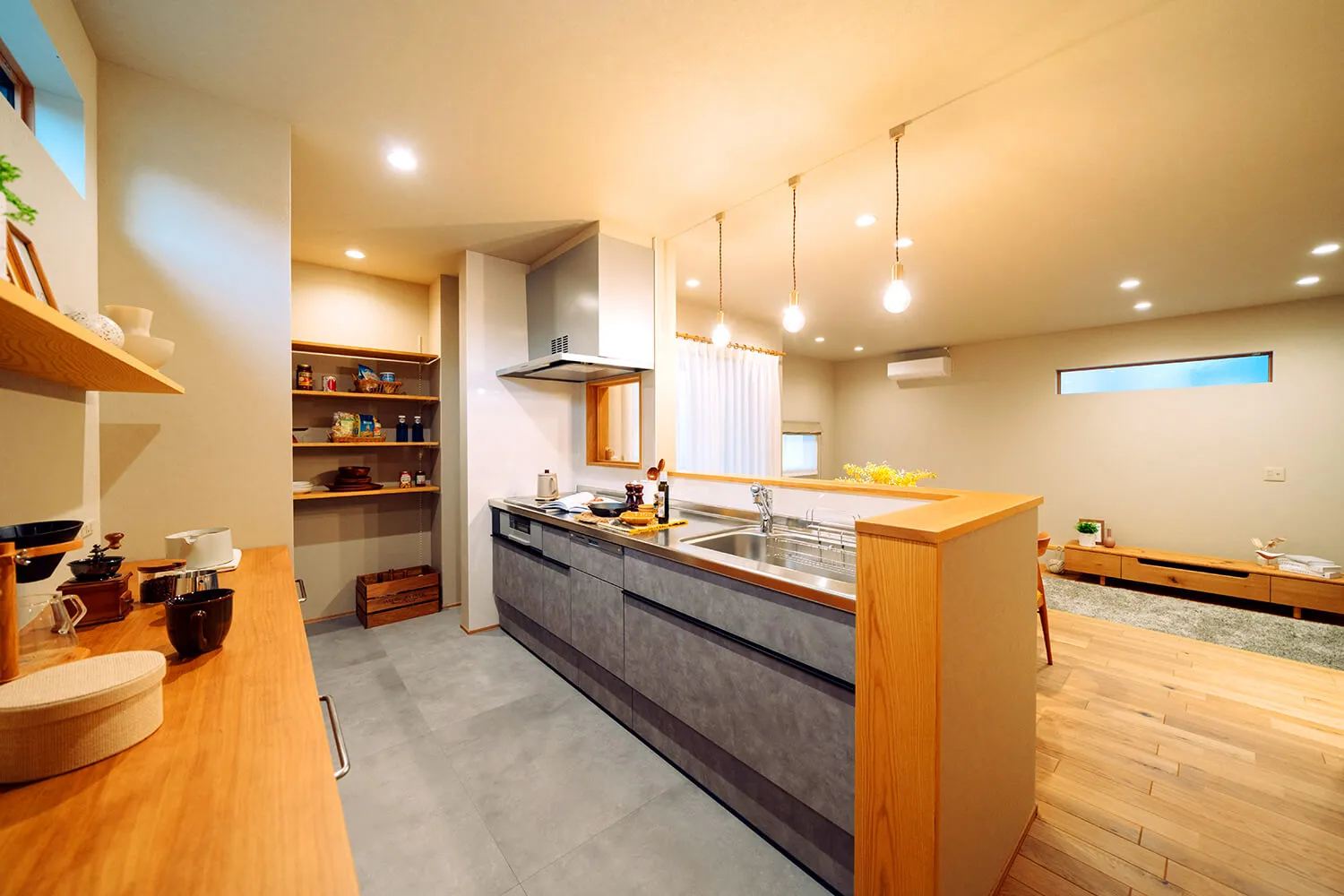 キッチンは対面式でレンジフードの下には造作の内窓も付いているので、料理をしながら常に家族の様子を見守ることができます。