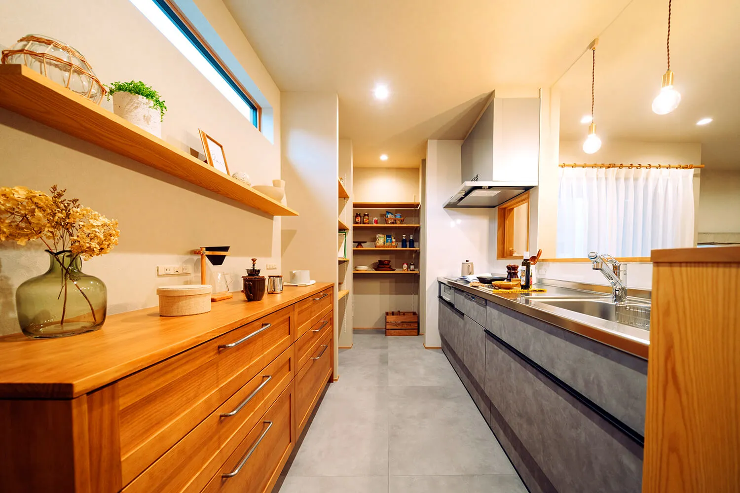 日用品や買い置きなどを収納することでいつもスッキリ片付いたキッチンに。