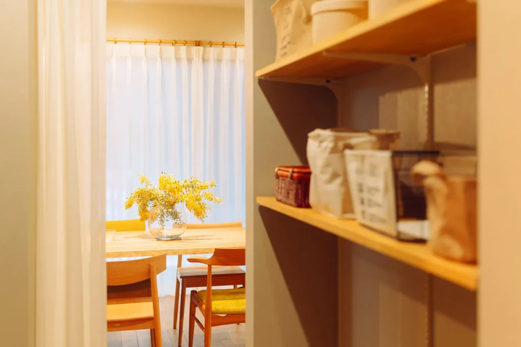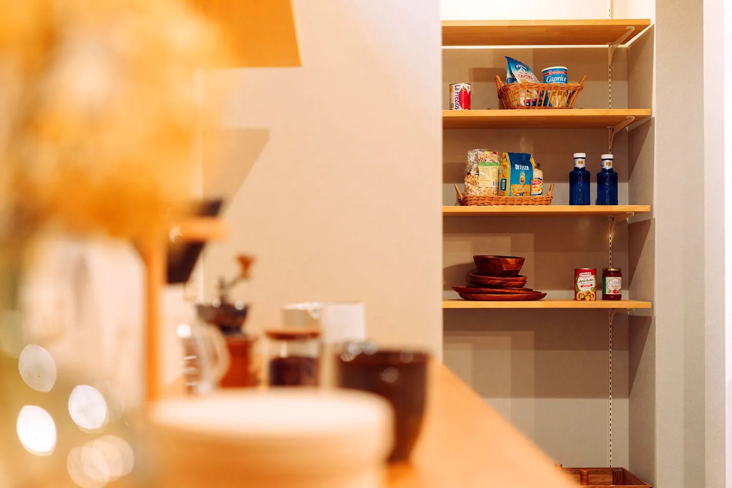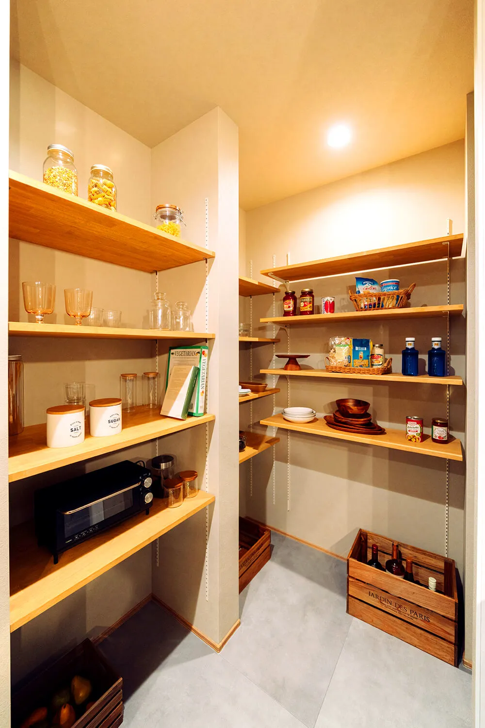キッチン横のパントリーはリビングからは見えない位置にあるので、生活感が出るゴミ箱や家電などを隠して収納することができます。