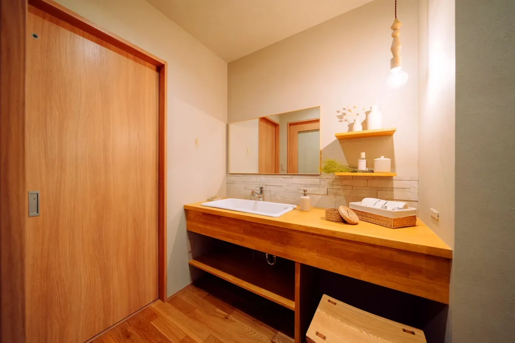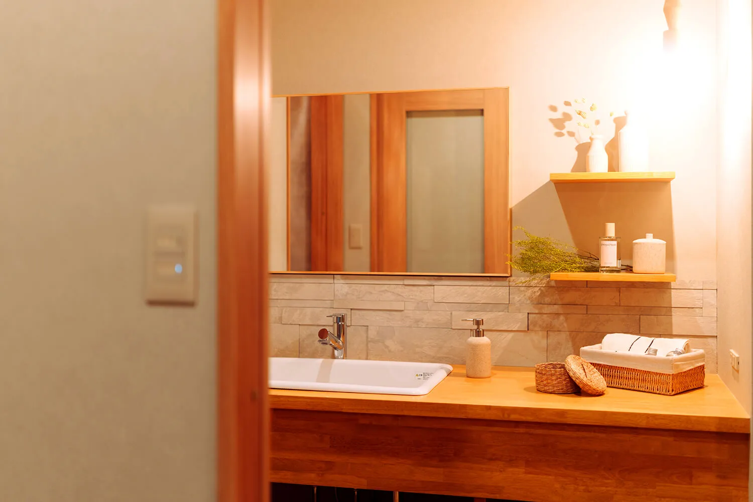玄関入ってすぐ横にあるので、帰宅後の手洗いが習慣づきます。2人並んで使える広いカウンターで朝の支度もスムーズに。