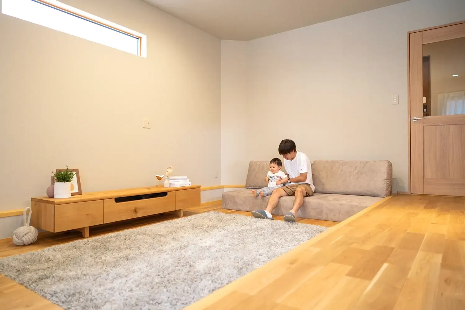 床を一段下げることで空間を緩やかに仕切りつつも開放感があるリビングに。