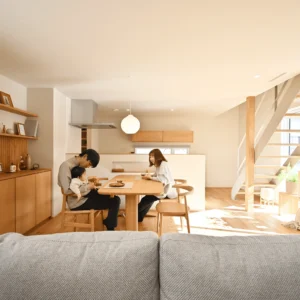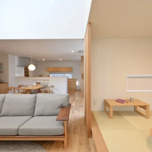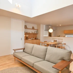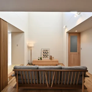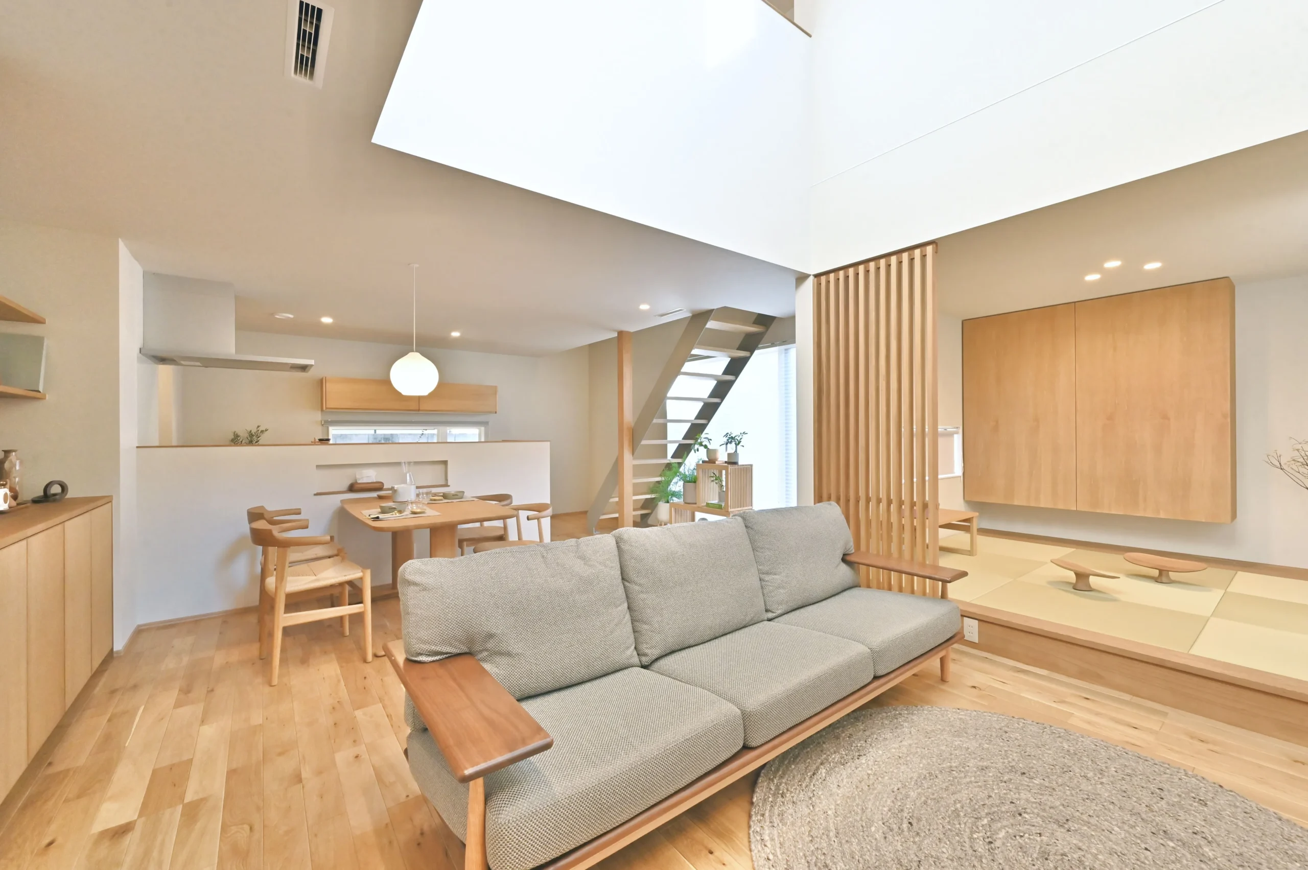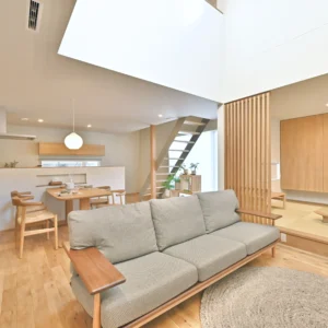 家の中に入ると、光に満ちた吹抜けリビング。