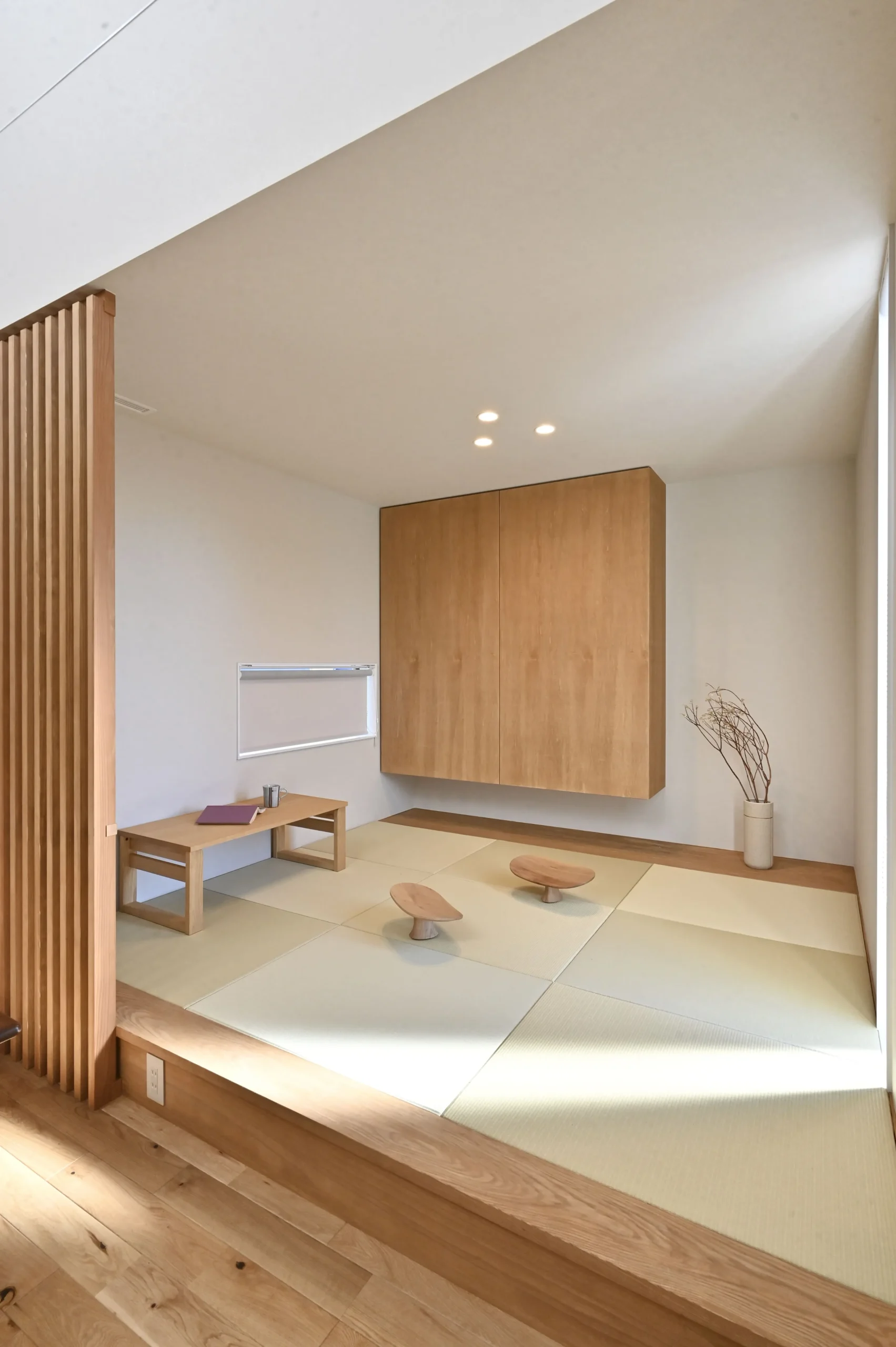 小上がりの和室には、格子の影が映り込み、